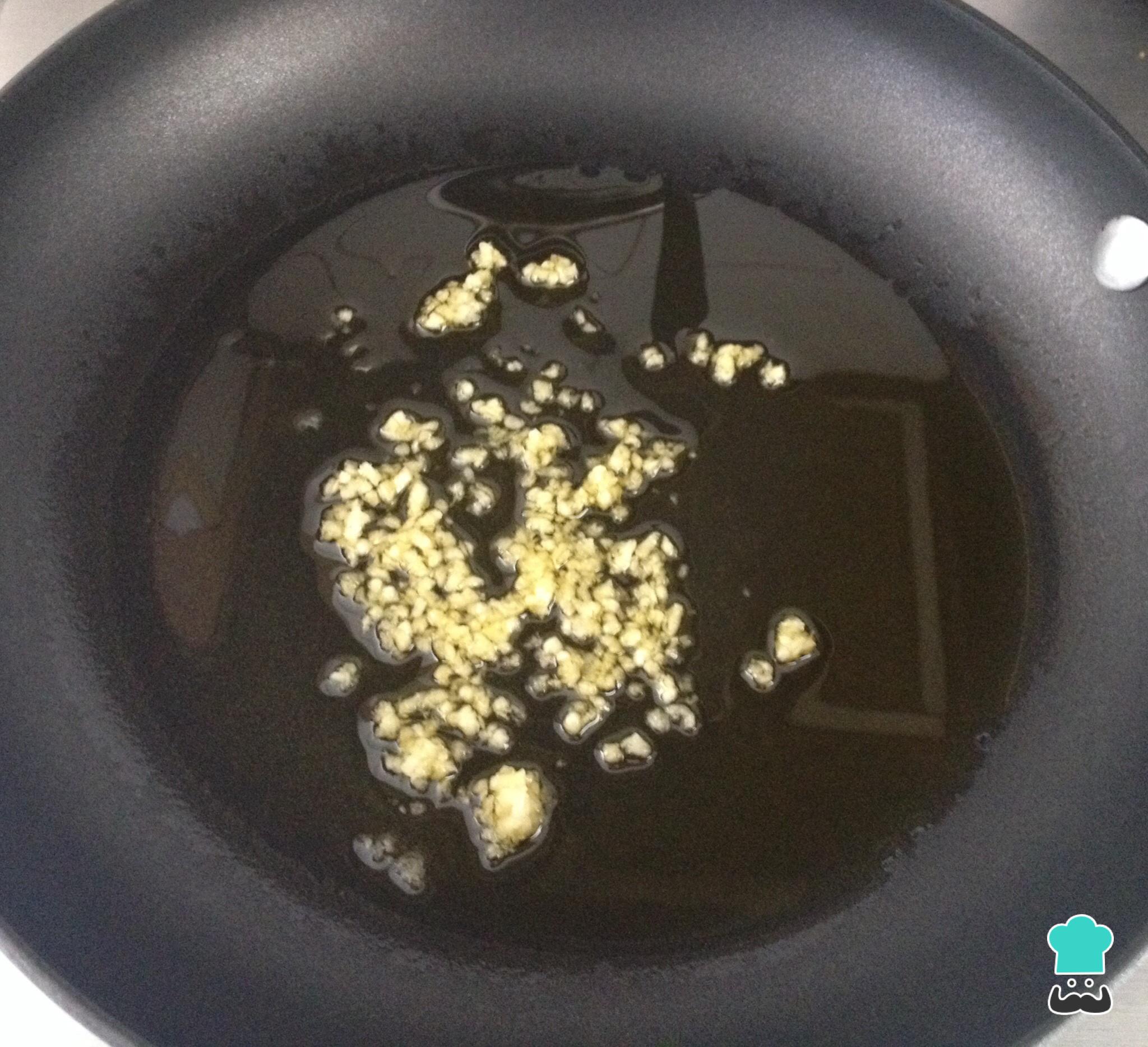 En una sartén con aceite de oliva, agregar el ajo cortado finamente y sofreír a fuego bajo durante 5 minutos, revolver constantemente para evitar que se queme.