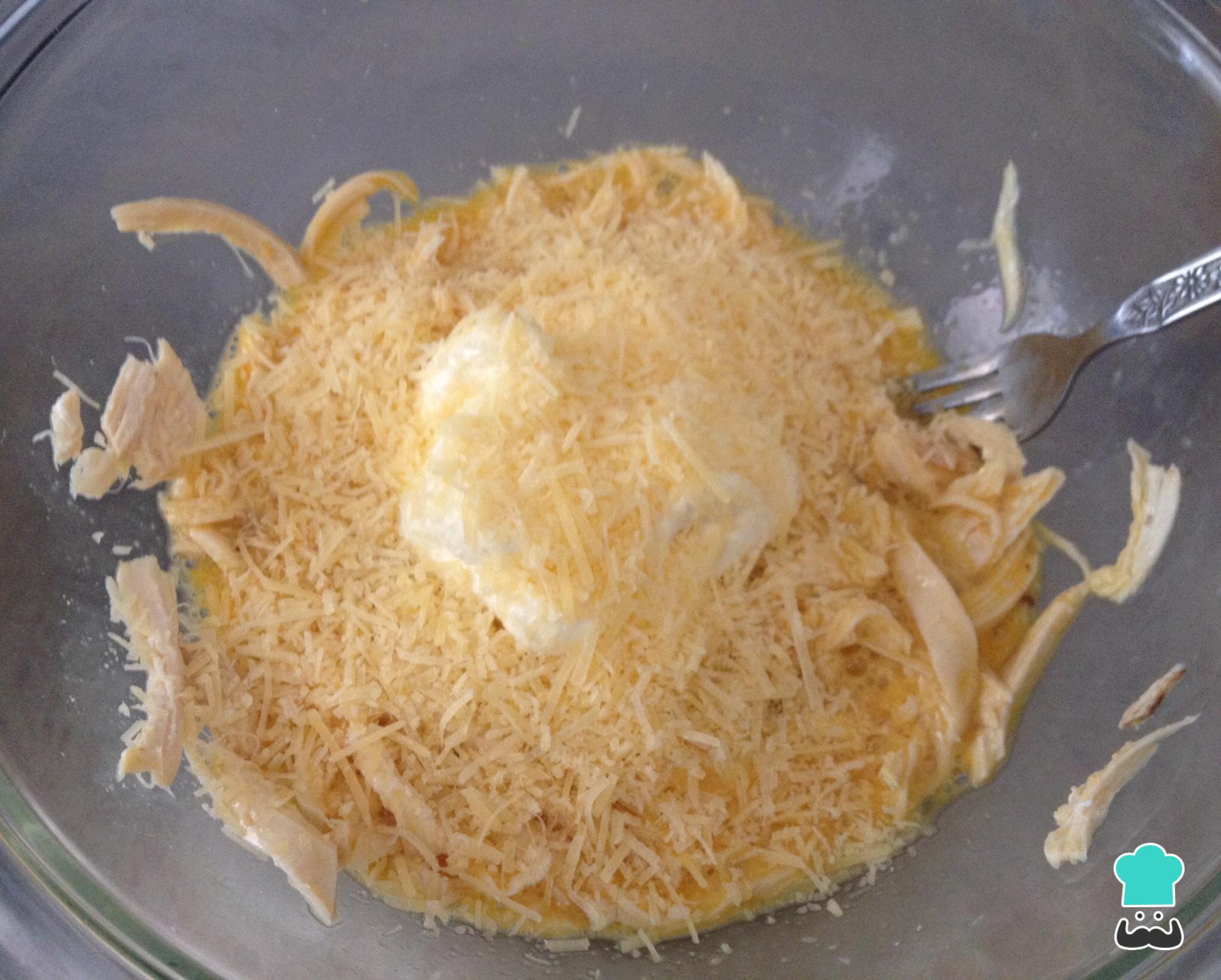 Aparte, en un bol mezclar los huevos con la crema de leche, el pollo desmenuzado y un poco de queso parmesano. El pollo también lo puedes aprovechar de otras recetas que te haya sobrado, recuerda que con este mismo pollo desmenuzado puedes hacer bocadillos como el sándwich de pollo y aguacate o el sándwich de pollo y queso.