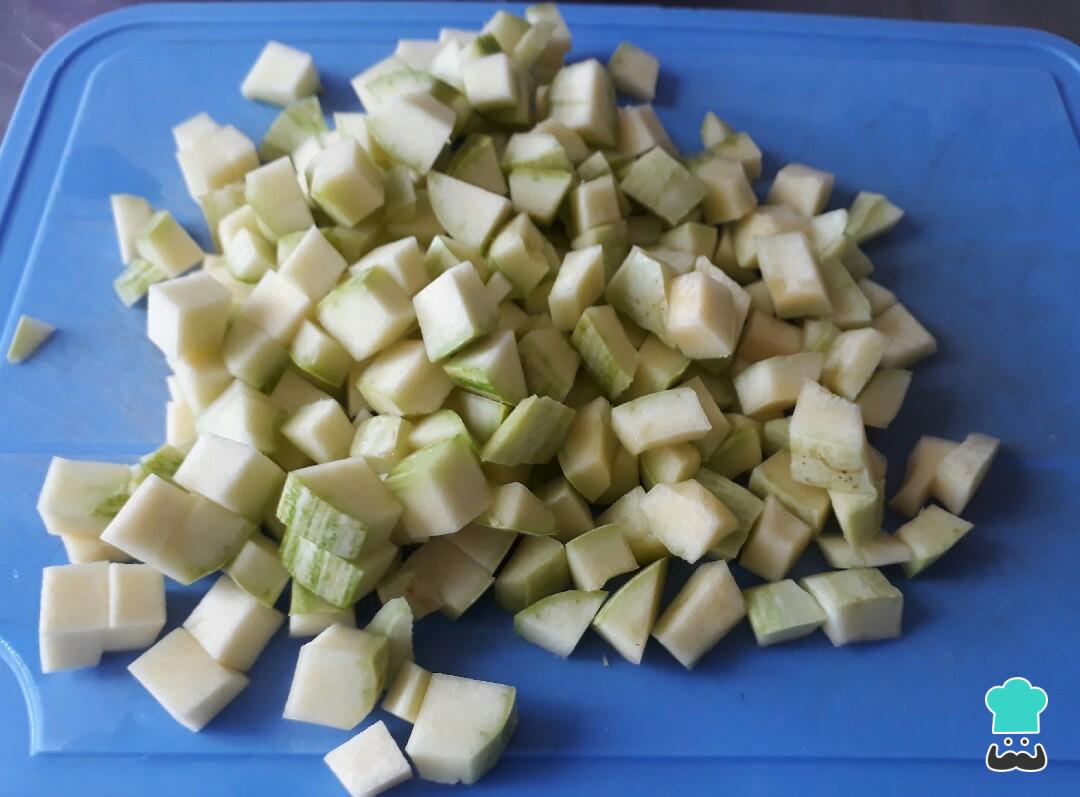 Empieza por lavar los calabacines, quitar las semillas y cortarlos en cubos pequeños.