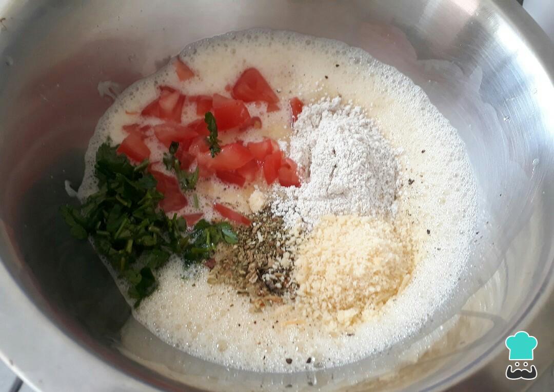 Agrega el resto de los ingredientes del pastel de calabacín vegetariano a los huevos batidos y por supuesto, los calabacines picados y las especias y hierbas al gusto, y mezcla todo muy bien.