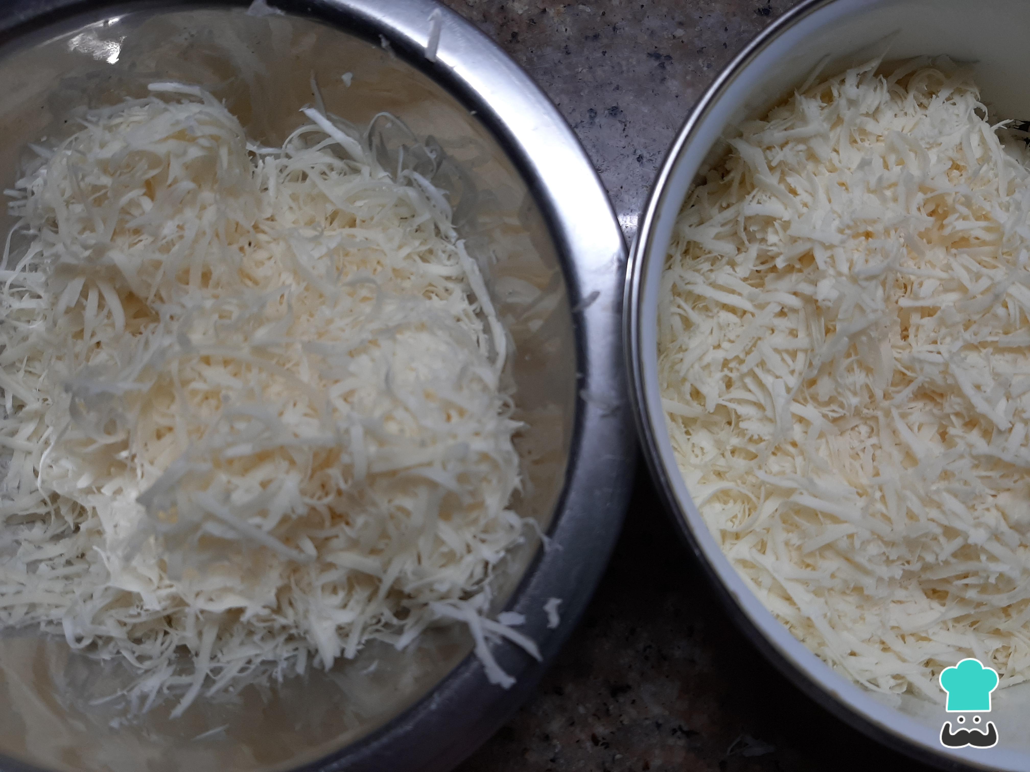 ¡Empezamos con la receta de pastel de choclo con queso! Debes rallar el queso mozzarella con el paria en un bowl y reservar. Pre-calienta el horno a 170 grados.