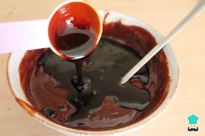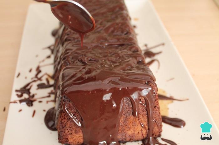 Con una cucharilla, vamos rociando esta salsa por encima del bizcocho de chocolate.