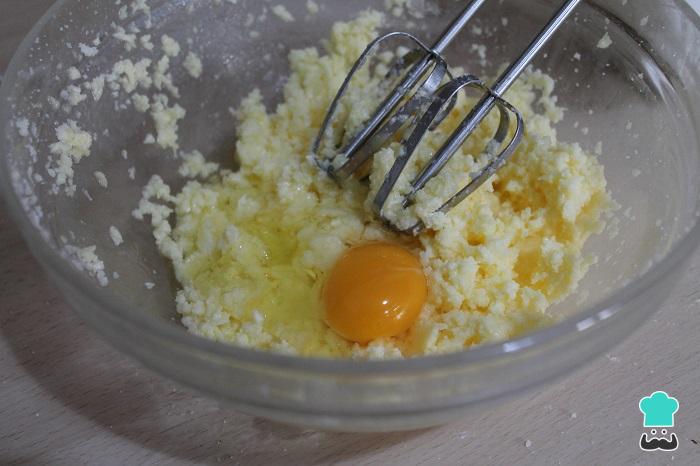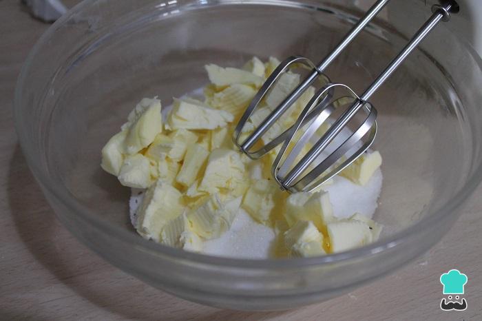 Precalentamos el horno a 180 ºC. En un bol, ponemos la mantequilla en trozos y reblandecida (la podéis meter unos segundos en el microondas para ello), junto con el azúcar y batimos todo con ayuda de unas varillas eléctricas.