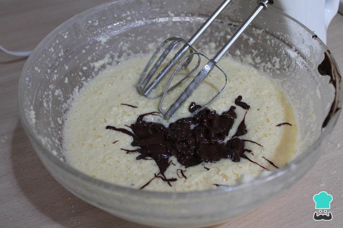 Añadimos el chocolate fundido que teníamos reservado y seguimos batiendo con la batidora o varillas eléctricas.