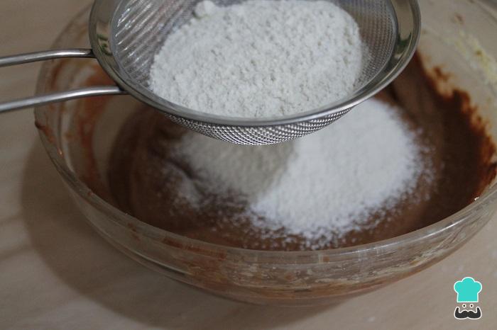 Mezclamos los polvos de hornear junto con la harina y tamizamos encima de la masa del pastel de chocolate. Esta vez, mezclamos con una espátula suavemente pero integrando bien la harina.