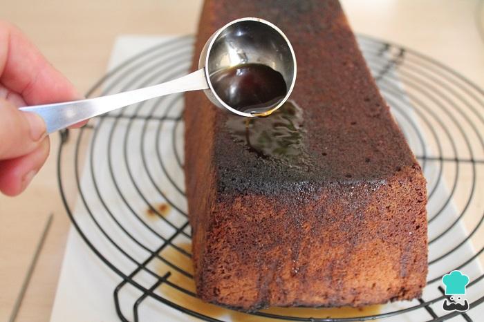 Dejamos enfriar el bizcocho dentro del molde de 5 a 10 minutos antes de desmoldar. Lo ponemos encima de una rejilla con una bandeja debajo una vez desmoldado. Pinchamos la superficie del pastel con una brocheta, sobre todo por los bordes del pastel, pues siempre se queda esa zona más reseca, y vamos rociando poco a poco el pastel con el sirope de café. No añadimos más líquido hasta que no se haya filtrado todo en el interior del bizcocho. Así hasta que terminemos todo el sirope.