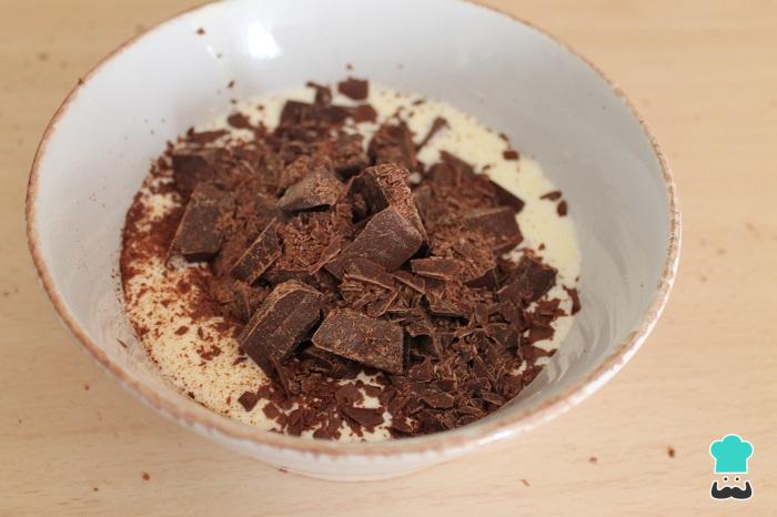 Por último, haremos una salsa para decorar el pastel de chocolate húmedo y esponjoso. Para ello, hervimos la nata líquida en el microondas, sacamos y añadimos el chocolate troceado. Removemos bien hasta que el chocolate se haya fundido del todo.