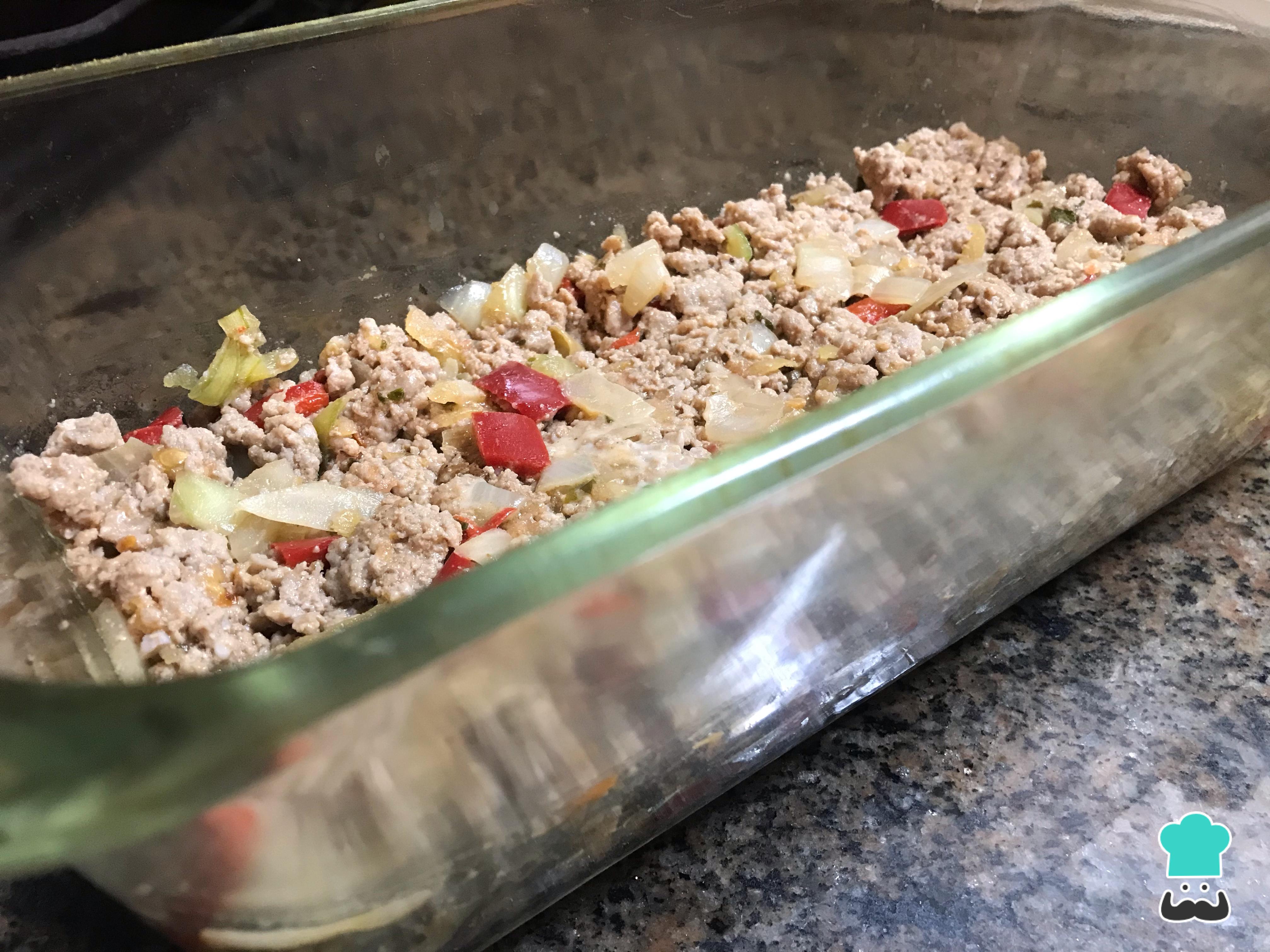 Empieza el armado del pastel ubicando la carne debajo en un recipiente apto para horno. ¡Ya casi está el pastel de corbatitas fácil!