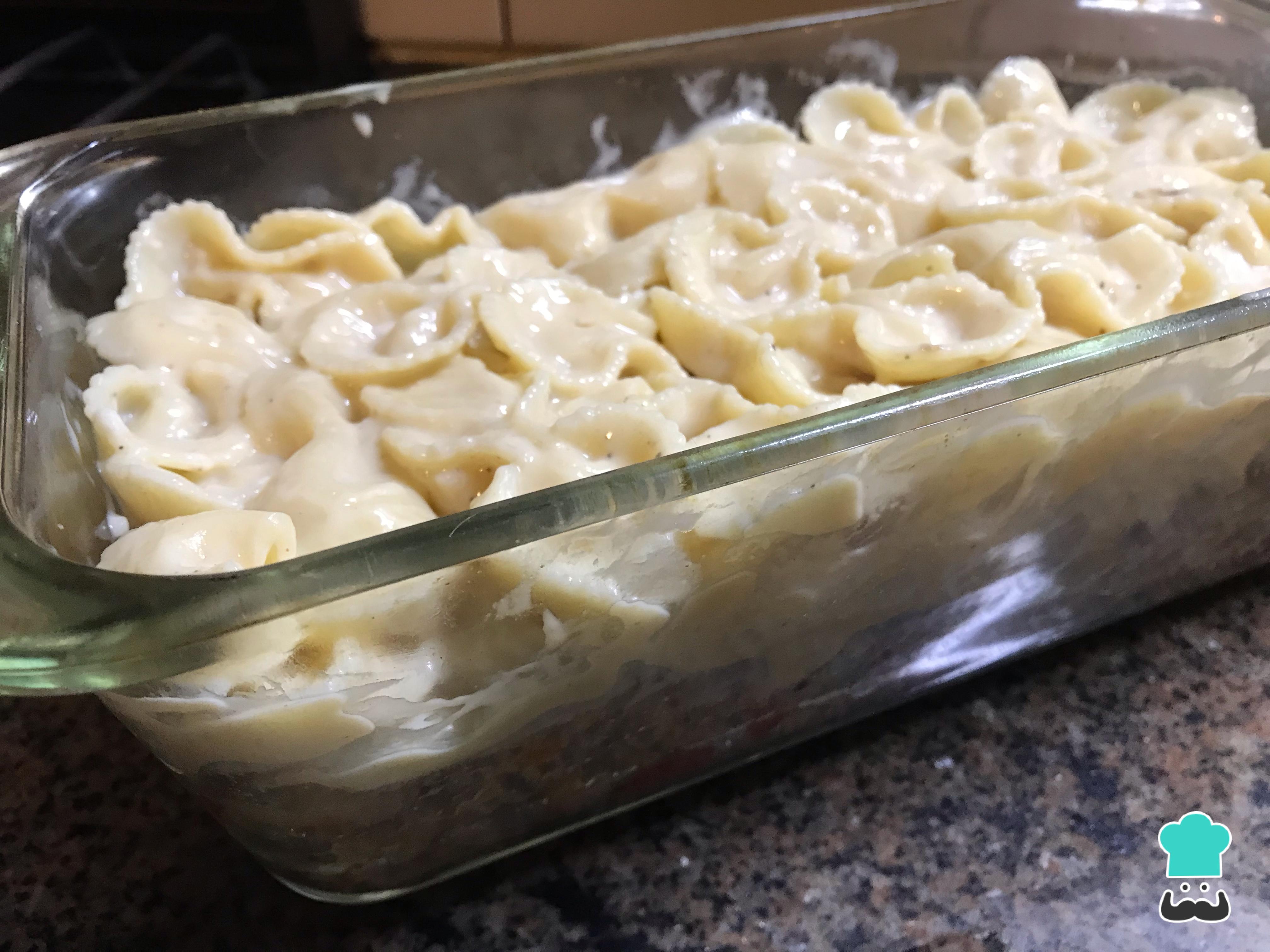 Encima de la carne, agrega la mezcla de corbatitas, salsa blanca y huevo. Ejerce algo de presión para que tu pastel de corbatitas quede bien compacto. Caliéntalo en el horno a 200 ºC aproximadamente 15-20 minutos.