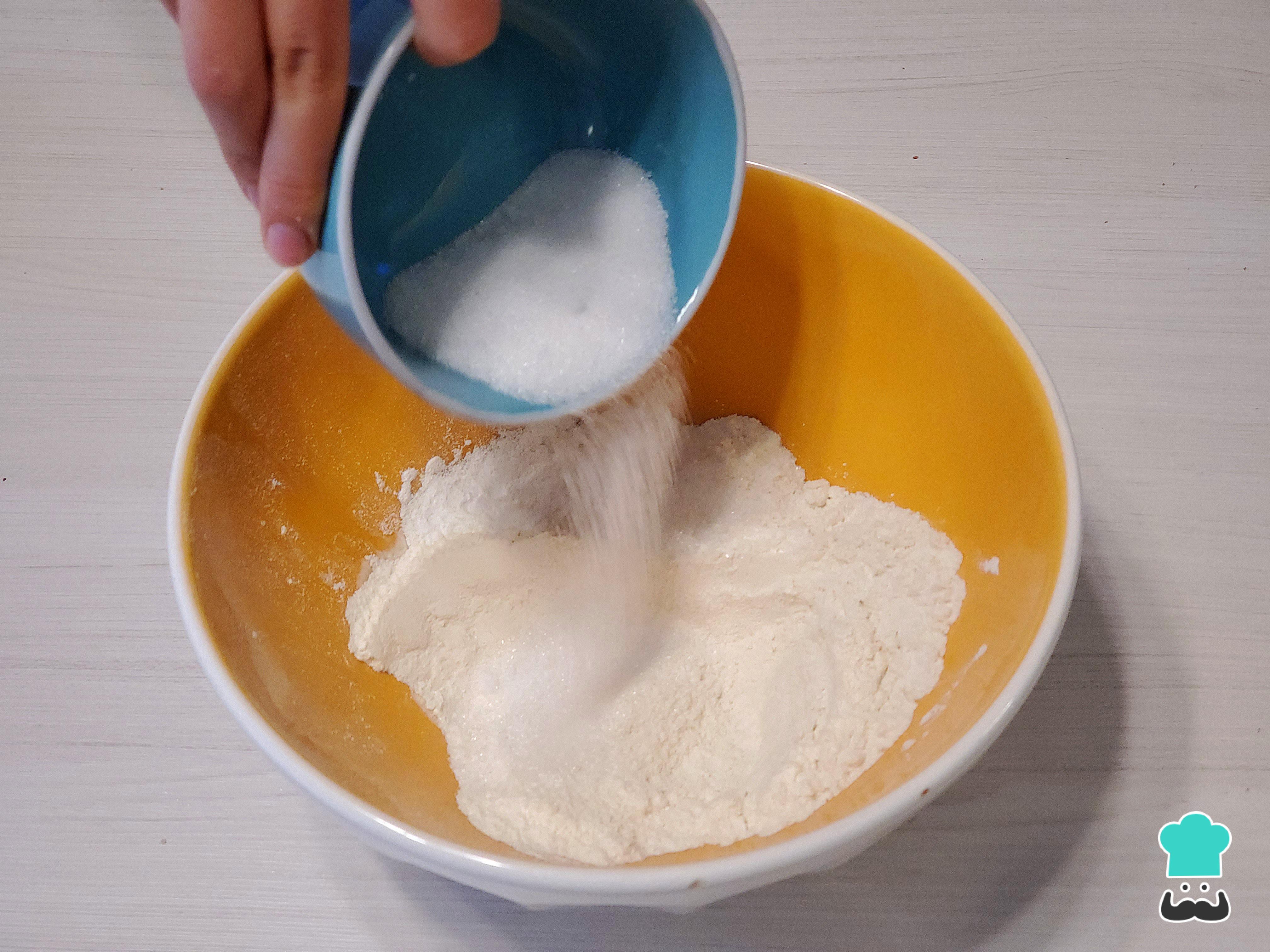 Empieza mezclando en un bol los ingredientes secos, es decir, la harina, el polvo de hornear, la pizca de sal (puedes cernir estos insumos para tener unos pancakes aún más tiernos) y el azúcar.