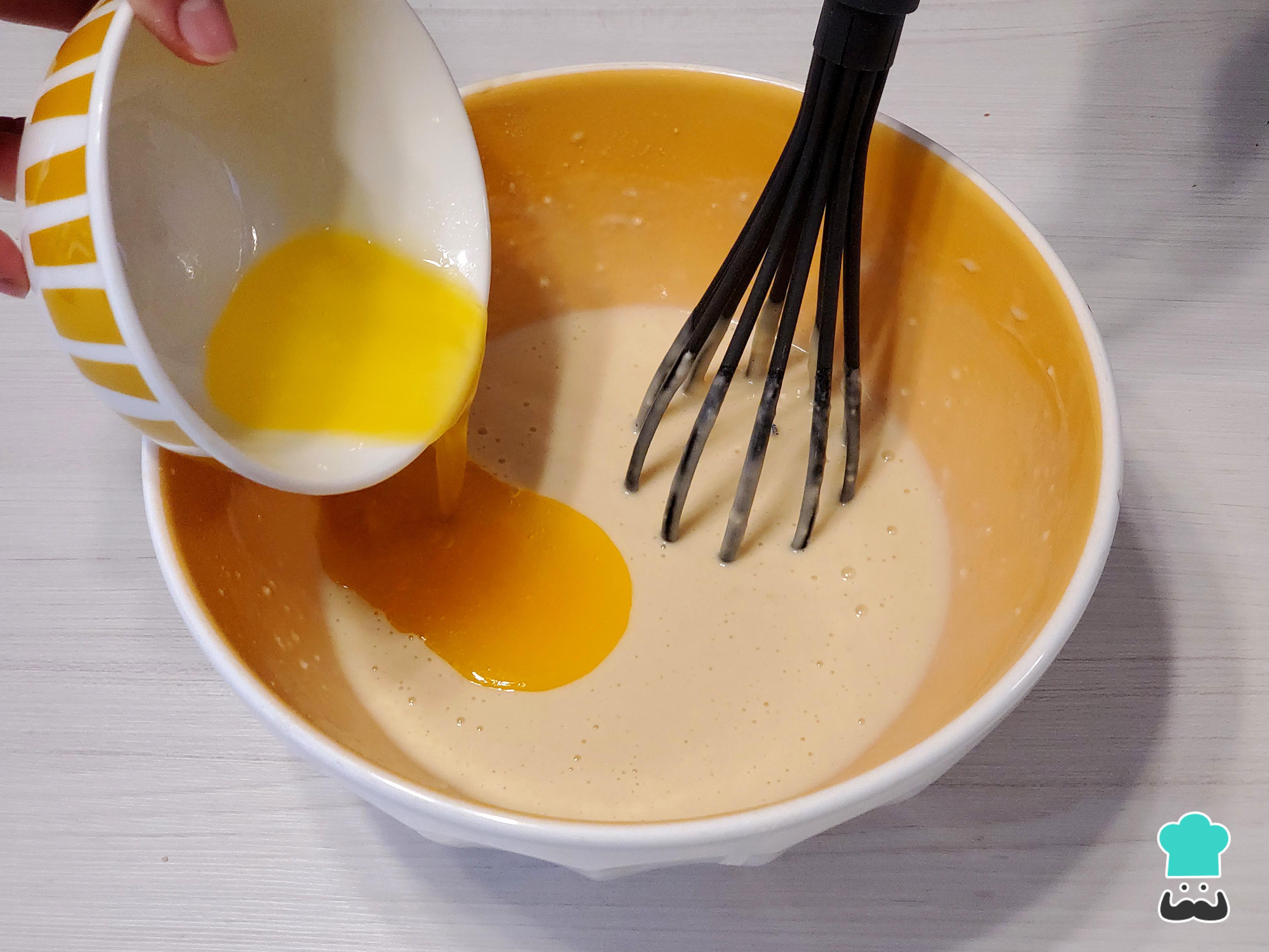 Cuando no haya ningún grumo en la masa, vierte la mantequilla derretida y mezcla bien.