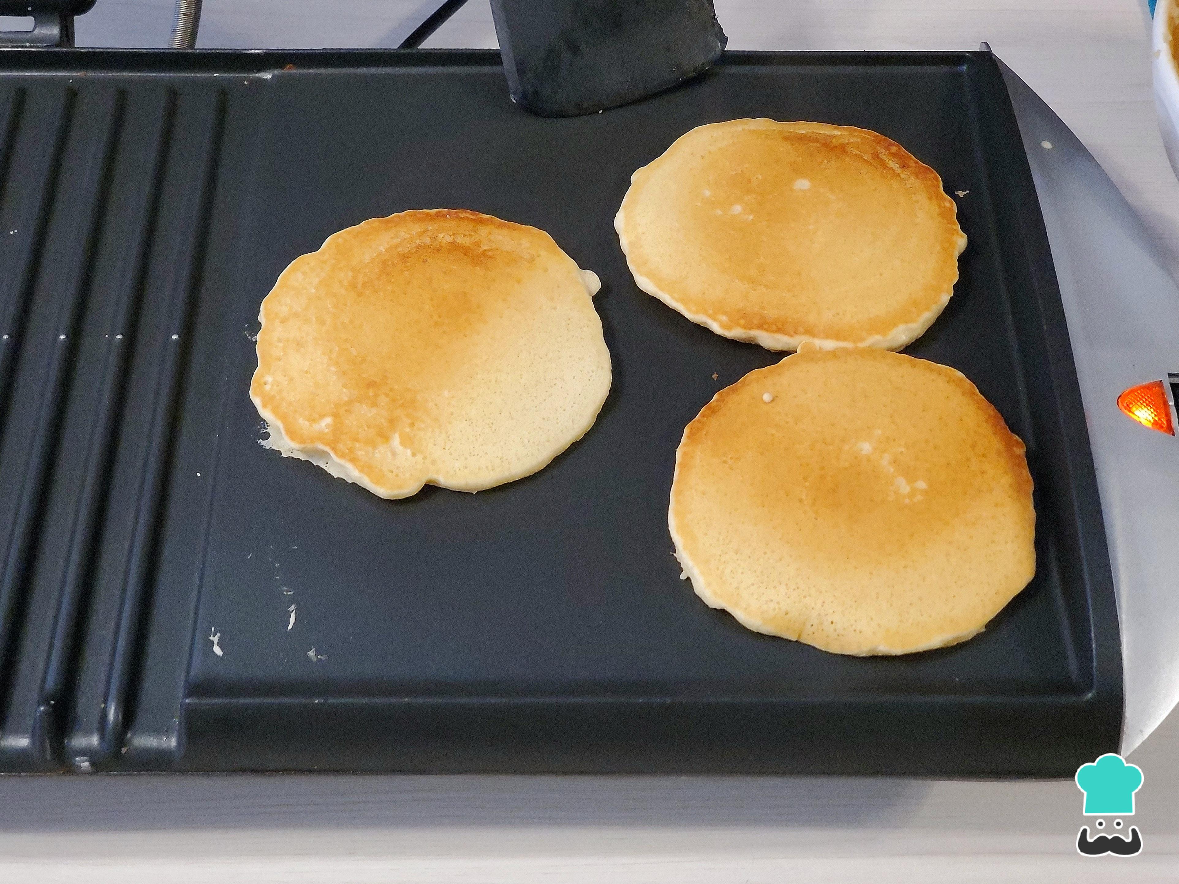 Permite que la masa burbujee y al ver que ya no está líquida porque se ha formado una capa encima, introduce una espátula por debajo del pancake y dale vuelta. Esa cara debe verse dorada, si lo está, deja que el otro lado también tome color.