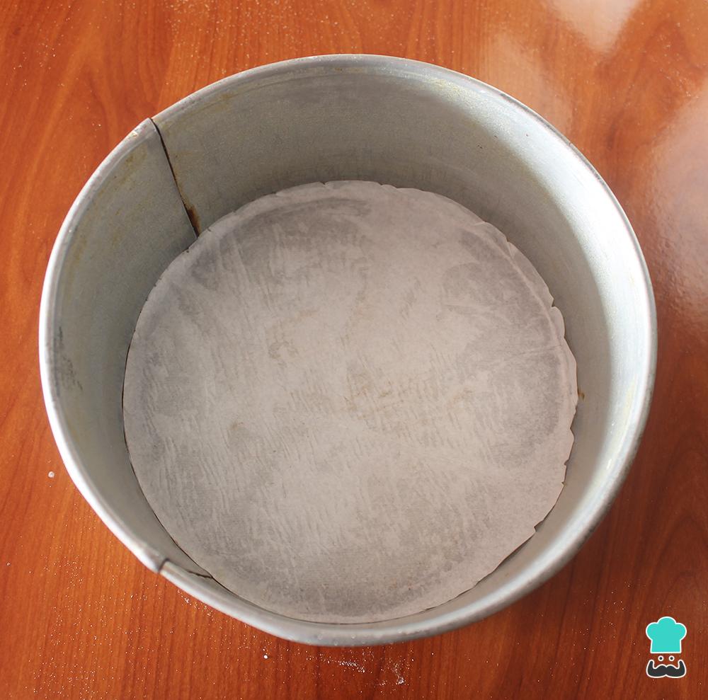 Lo primero que hay que hacer para preparar este pastel de tres leches individual es forrar la base de un molde redondo de 18 cm con papel manteca.
