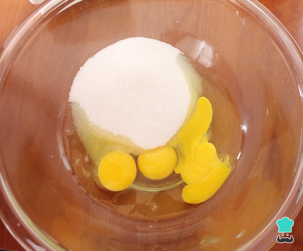 En un bol limpio y seco colocar los huevos y el azúcar y batir con una batidora eléctrica por 10 a 15 minutos.