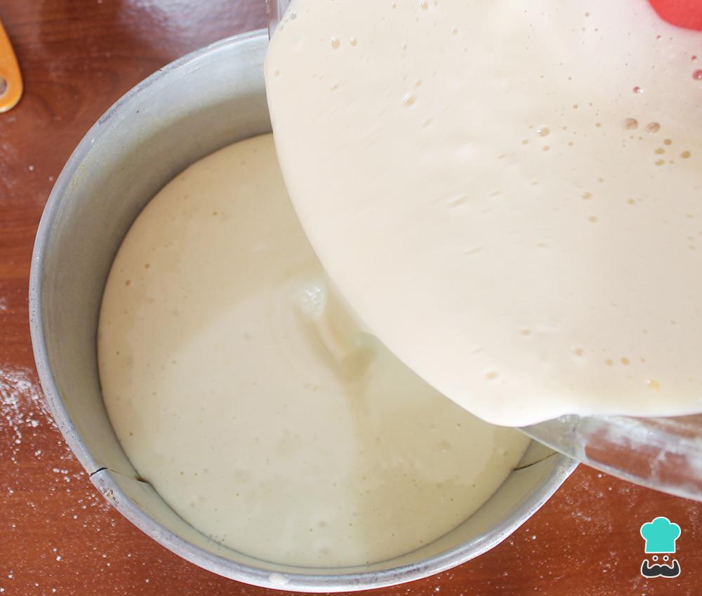 Verter la preparación del bizcochuelo para la torta tres leches individual en el molde preparado y llevar al horno precalentado a 160° C por aproximadamente 50 minutos. Insertar un palito y si sale limpio, sacar del horno el bizcocho casero y dejar entibiar.