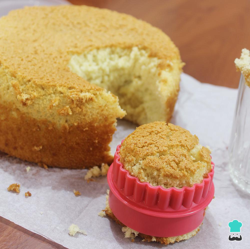 Con el bizcochuelo aún tibio cortarlo con cortadores de galletas redondos como se ve en la foto. Hacerlos con cuidado para que no se desbarate. También podéis utilizar vasos o troqueles diferentes para hacer el postre de tres leches individual.