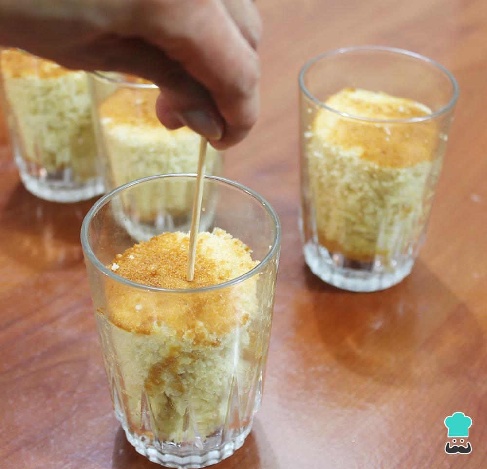 Colocamos los recortes que hemos hecho del bizcochuelo en vasos y pinchamoss con un palito en toda la superficie para que se absorba bien la mezcla del pastel de tres leches en vaso.