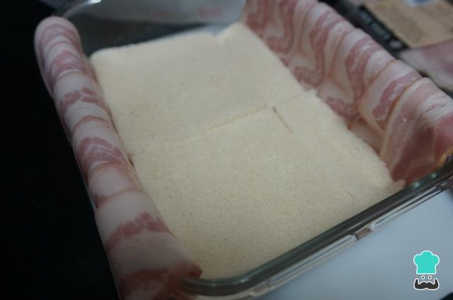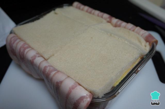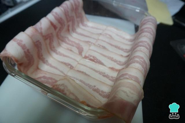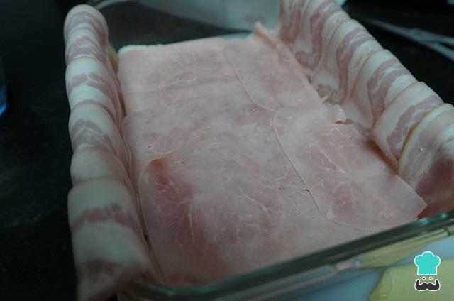 Finalmente, cerramos el pastel de pan de molde con las lonchas de bacon, cubriendo bien toda la superficie de nuevo.