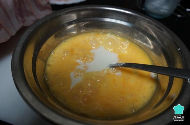 En un bol, ponemos los huevos batidos y la nata, y lo batimos todo bien.