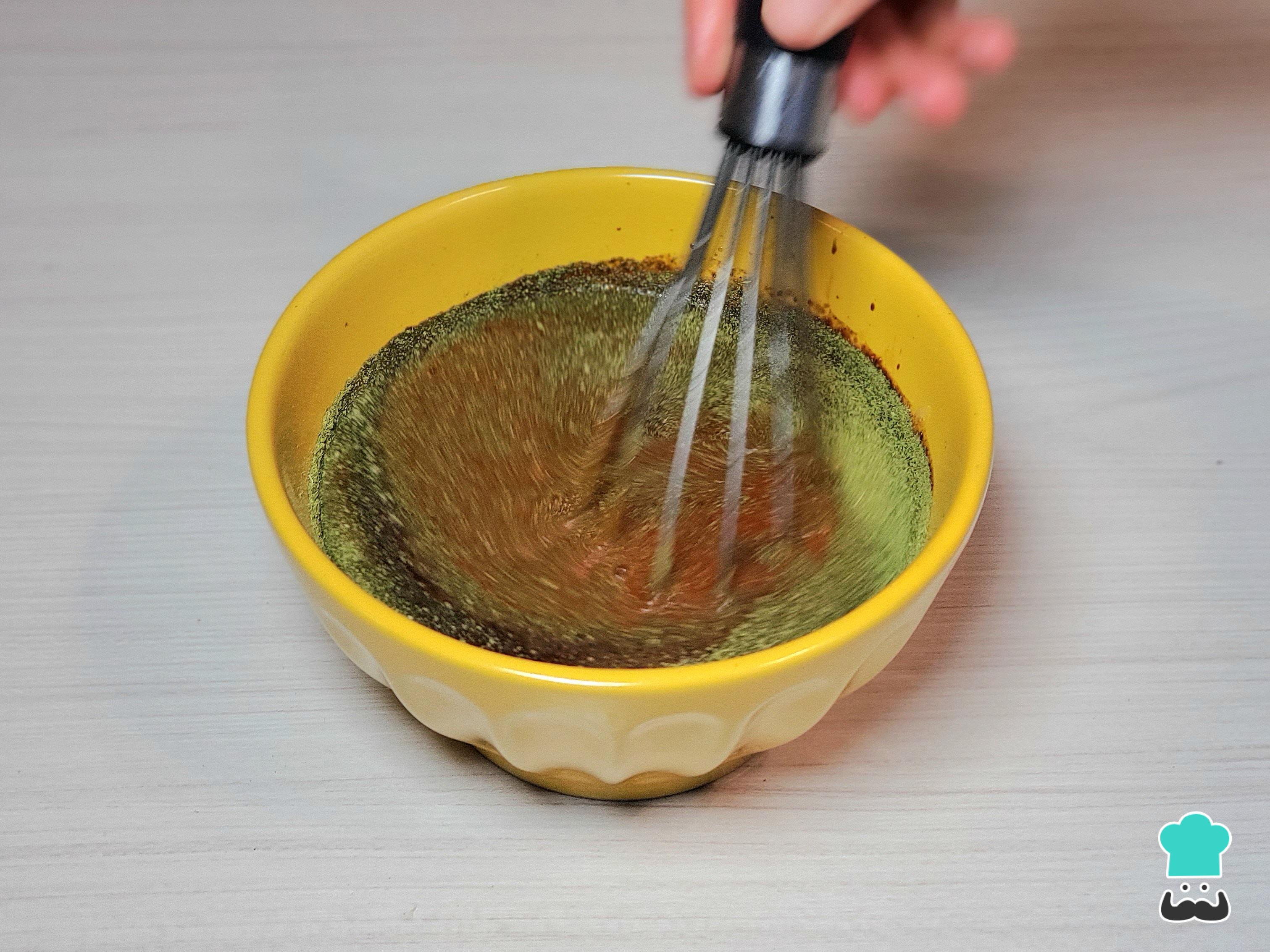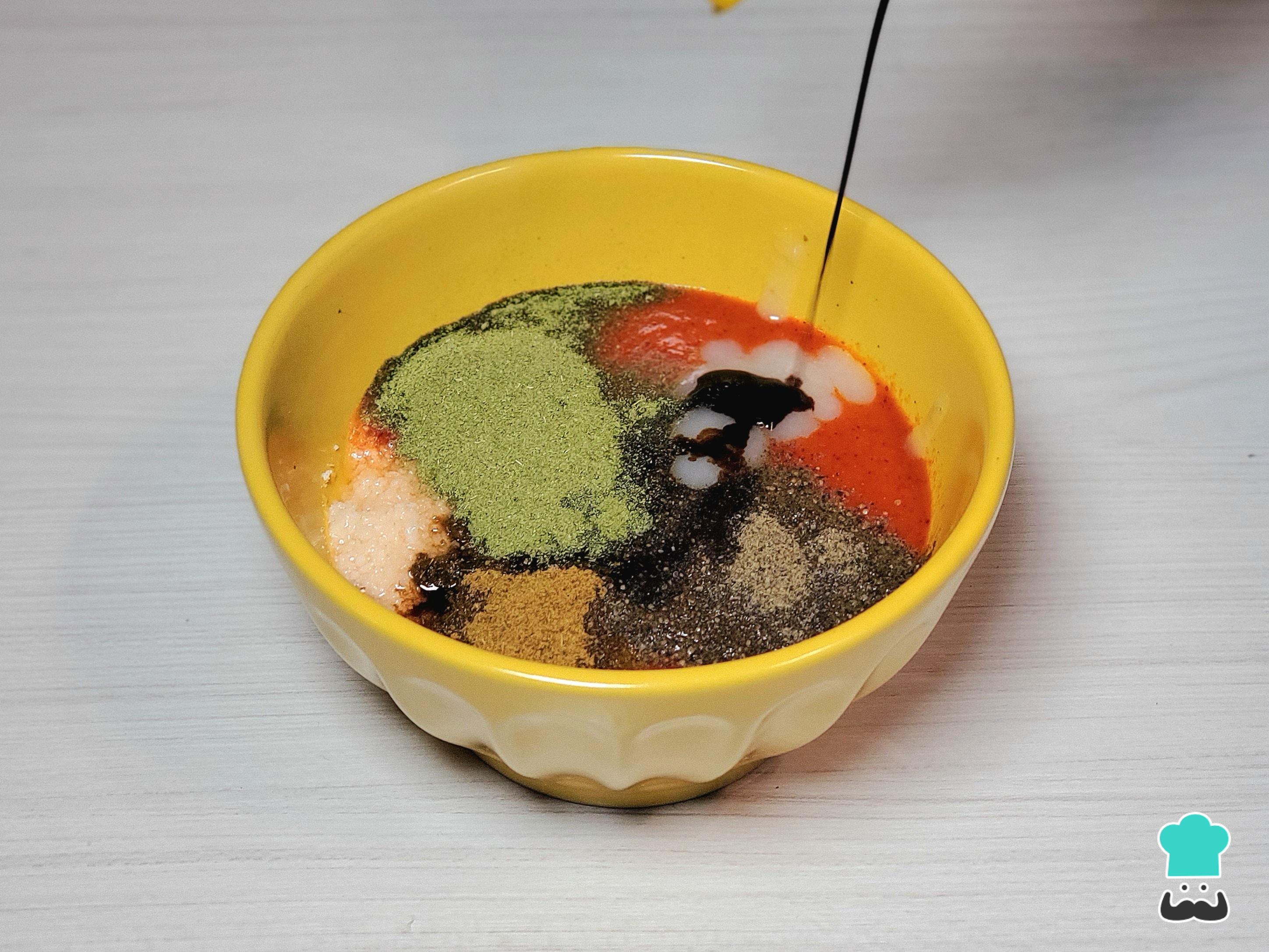 Para hacer el pavo de Navidad, empieza colocando en un bowl todas las especias: ají panca molido, ají amarillo en pasta, ajo molido, pimienta negra molida, comino molido, orégano en polvo y sal.