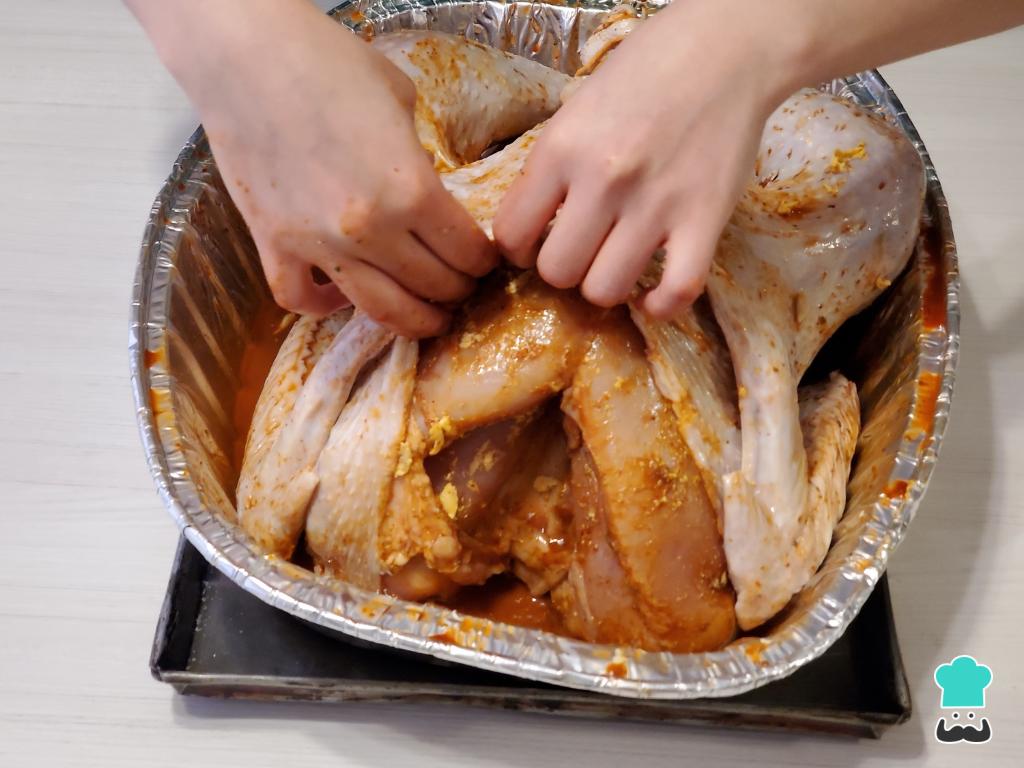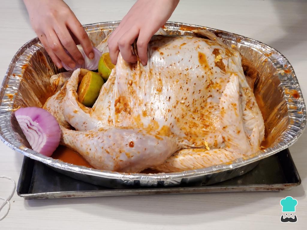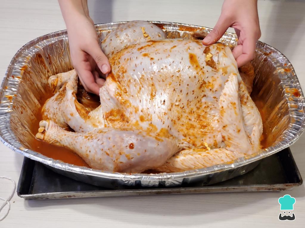 ¿Te preguntas cómo aderezar un pavo? Pues bien, cuando el pavo esté bien limpio, vierte el aderezo encima y embadúrnalo bien. No olvides levantar la piel y añadir más aderezo debajo. Si deseas, puedes inyectar un poco más de pisco o vino tinto en la pechuga y las piernas para que queden más jugosas y sabrosas. Deja reposar durante toda la noche o al menos 3 horas, asegurándote de darle vuelta o rociar con el aderezo el pavo cada media hora.