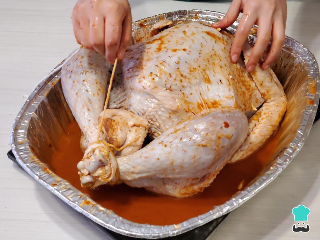 Antes de aderezar, lo más recomendable es dejar el pavo en salmuera durante toda la noche para que quede jugoso y el sabor penetre, especialmente en la pechuga, que suele ser insípida. La salmuera consiste en usar el 10% del peso del agua en sal, mezclarlo bien y sumergir el pavo limpio en esta solución, asegurándote de que quede completamente cubierto.
