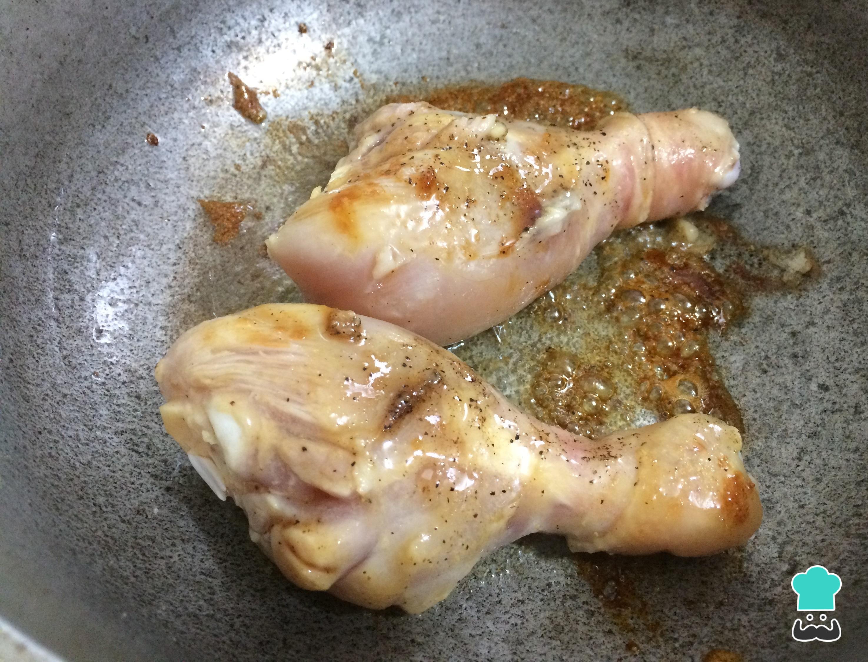 Añadir los muslos previamente salpimentados y sellar hasta que estén caramelizados por el papelón.