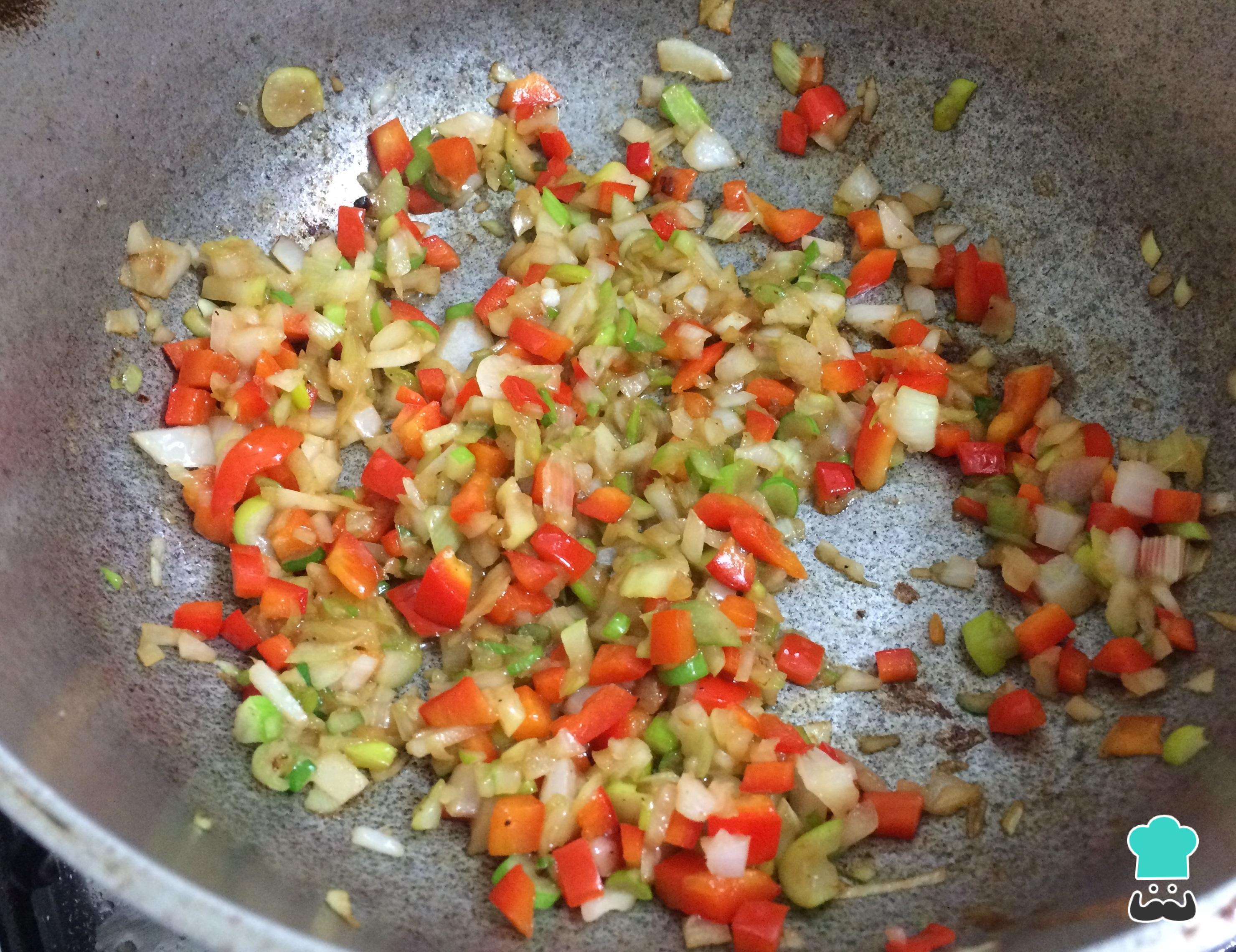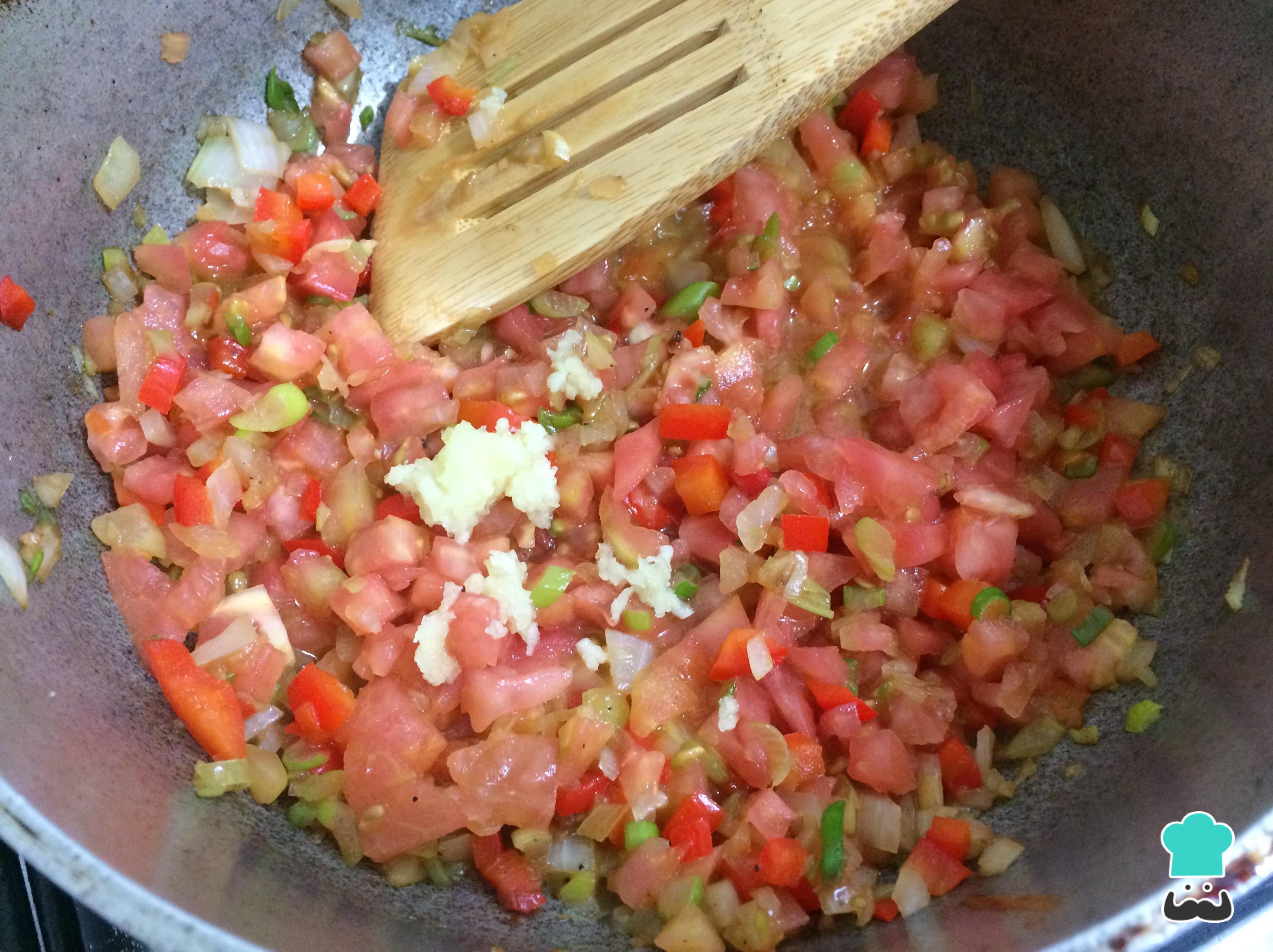 Agregar el tomate pelado y cortado en cubos pequeños, el ajo cortado finamente, cocinar a fuego bajo, tapado hasta que suelte sus jugos.