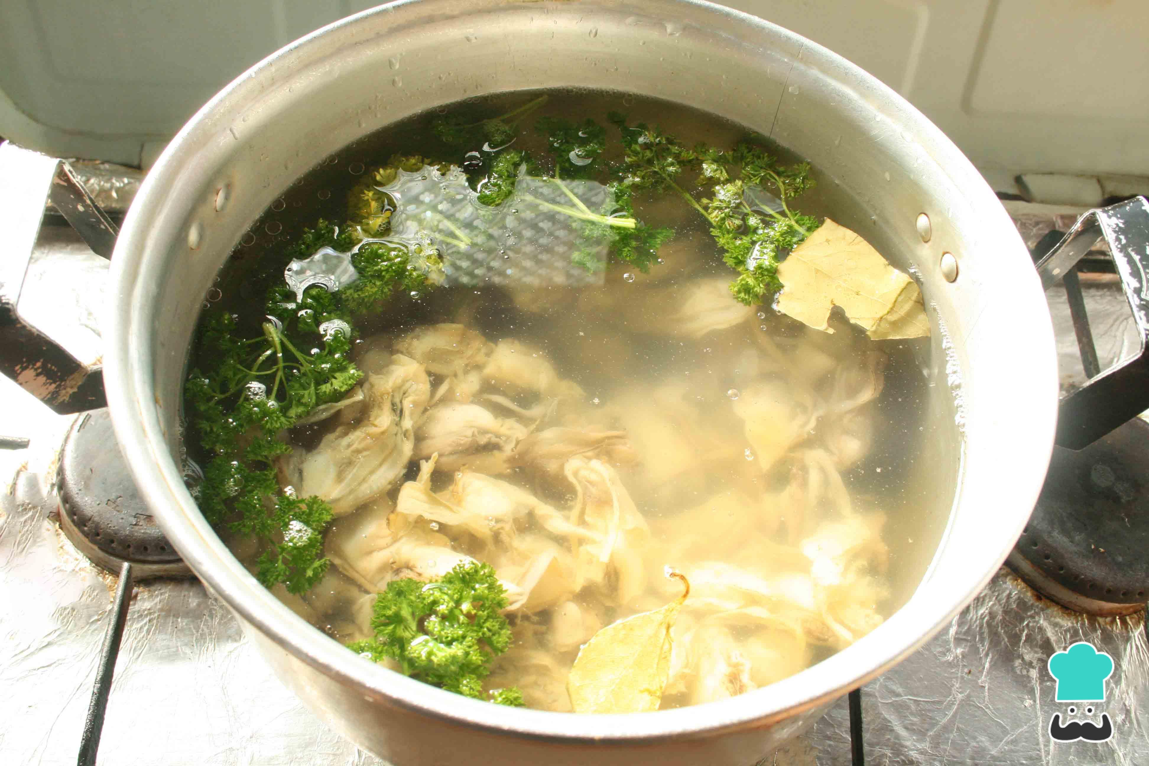 Prepara un cazo con abundante agua. Agrega las pepitonas limpias, la sal, la hoja de laurel, el perejil, el vino blanco, el vinagre de vino blanco, los granos de pimienta y un chorrito de aceite de oliva. Cocina a fuego medio.
