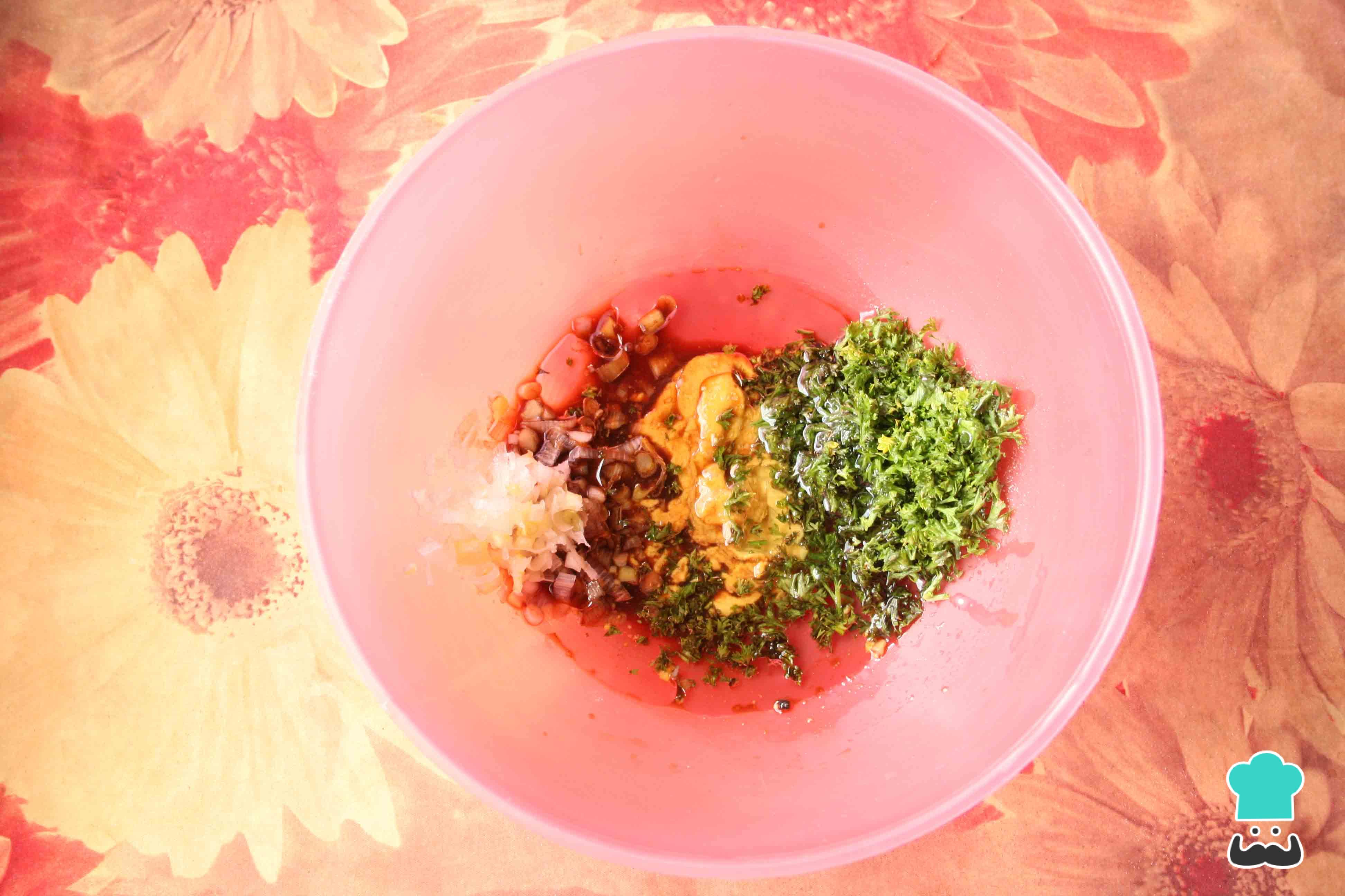 Preparamos la salsa vinagreta en un bol grande donde echamos un poco de sal, la mostaza, el vinagre, unas 6 cucharadas de aceite de oliva, un poco de perejil cortado finito y una pizca de pimienta molida (preferiblemente blanca). Mezclamos bien y reservamos.