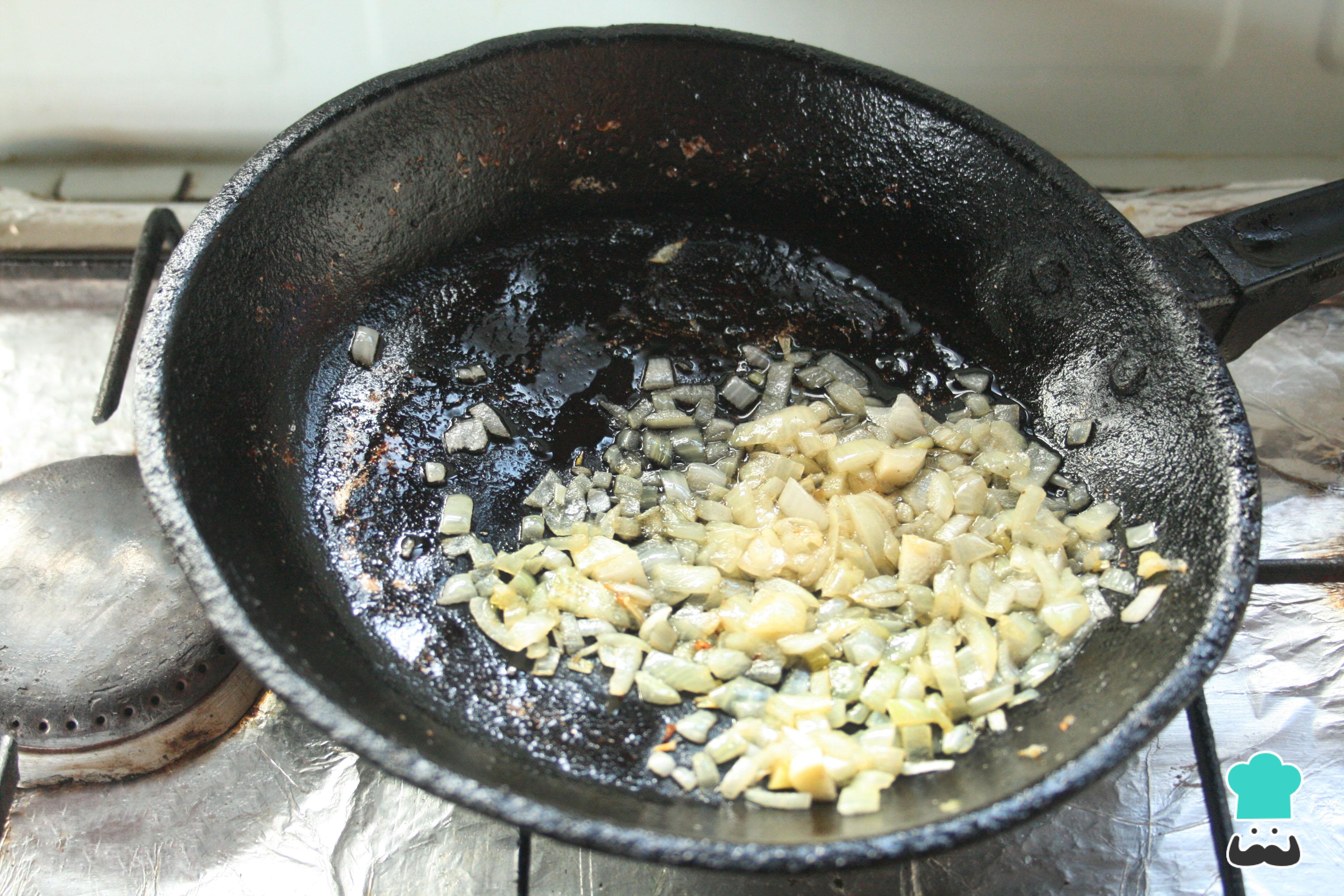 Prepara una sartén con un chorrito de aceite de oliva para preparar el fondo de las pepitonas guisadas. Agrega una cebolla picada finamente y remueve hasta que se ablande.