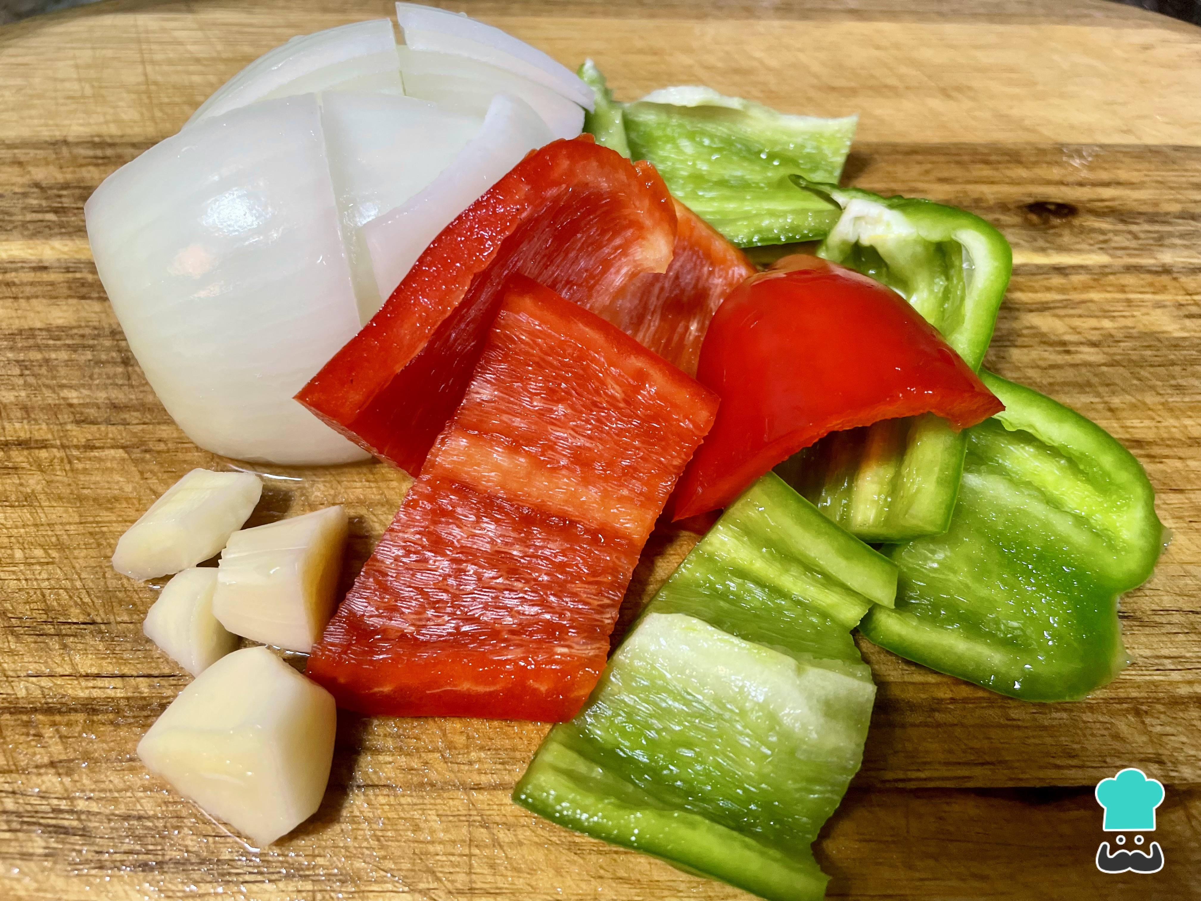 Lava, pela y corta la cebolla, los ajos y los pimentones en trozos de tamaño mediano.