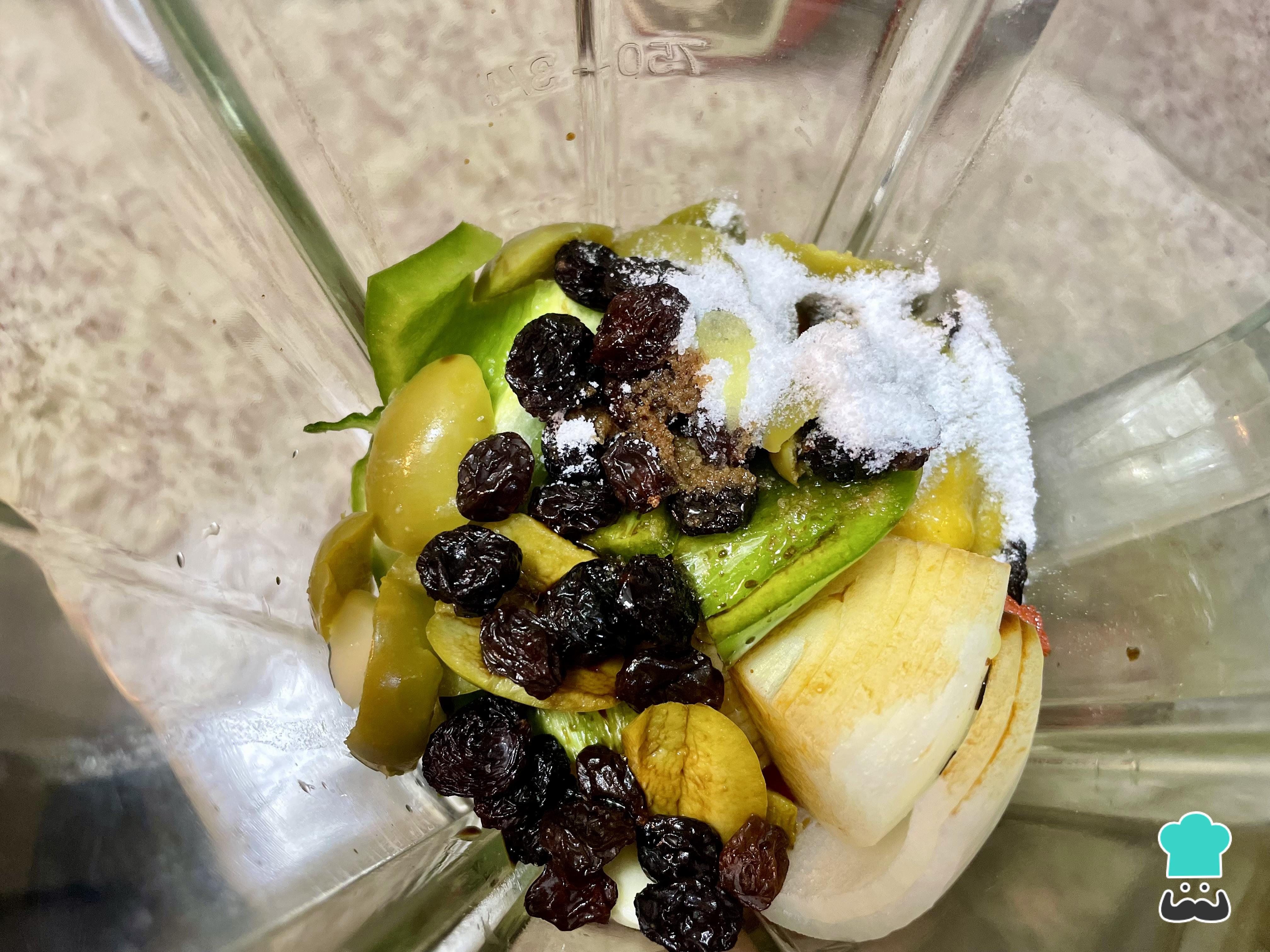 Coloca los vegetales en la licuadora y añade la salsa de soya, la mostaza, las pasas, las aceitunas, las alcaparras, el vino y la sal. Licúa todo hasta obtener una mezcla suave y homogénea.