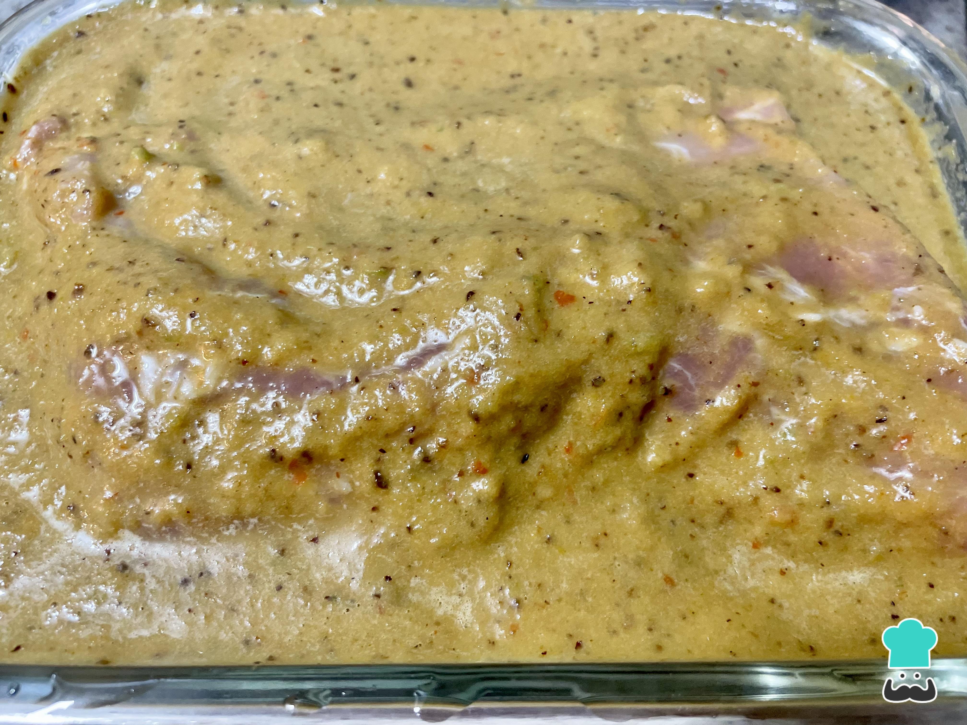 Coloca el cerdo en un bol y vierte la mezcla licuada sobre él, asegurándote de cubrir toda la superficie. Cubre el bol, refrigera y deja marinar por al menos 12 horas para que la carne absorba todos los sabores.