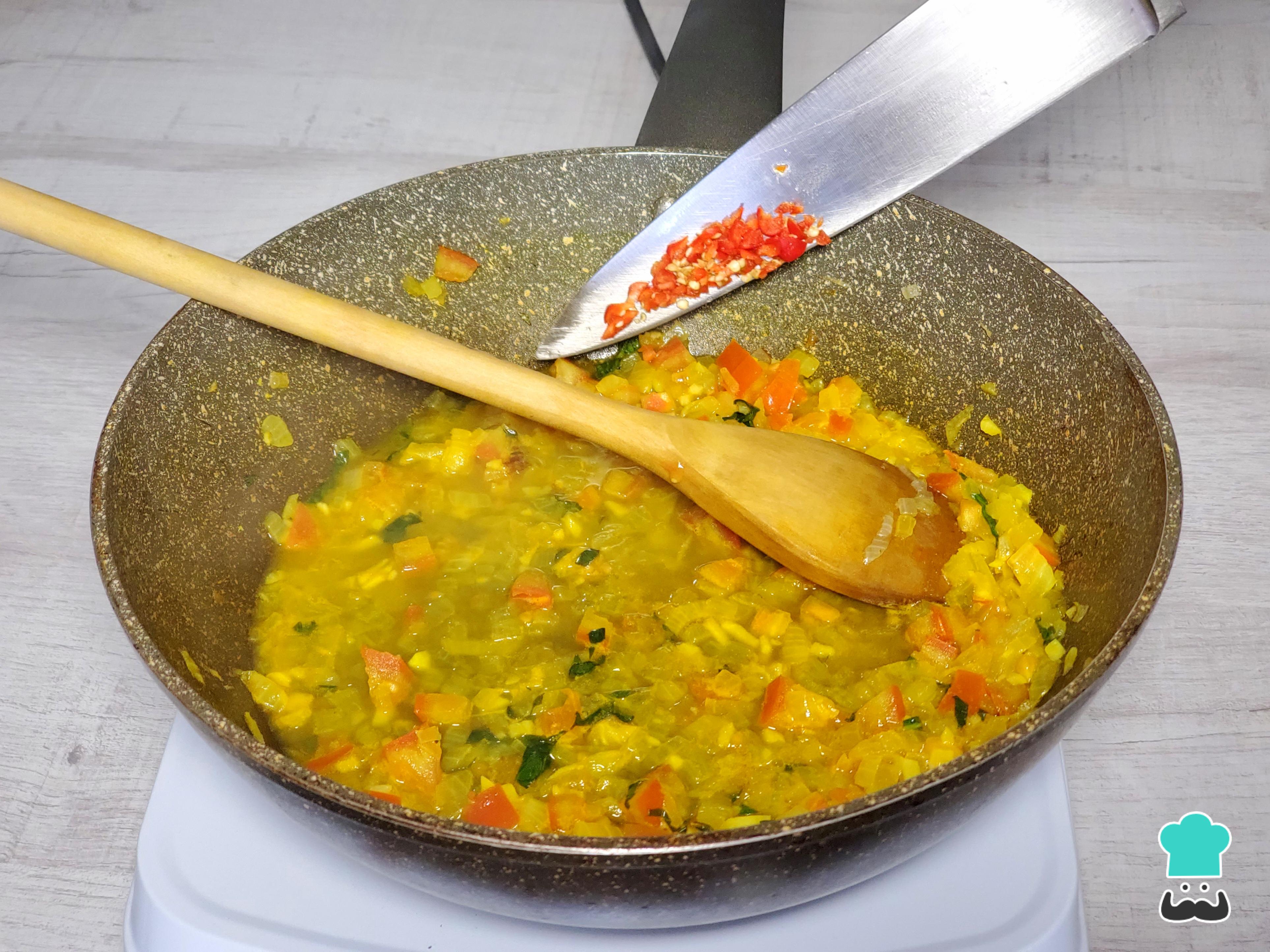 Agrega una el ají dulce picado y una pizca de azafrán, que puedes sustituir por palillo o cúrcuma en polvo. Remueve constantemente mientras cocinas el aderezo. Si notas que se está secando demasiado o quemando, añade un chorro de agua y sigue cocinando.