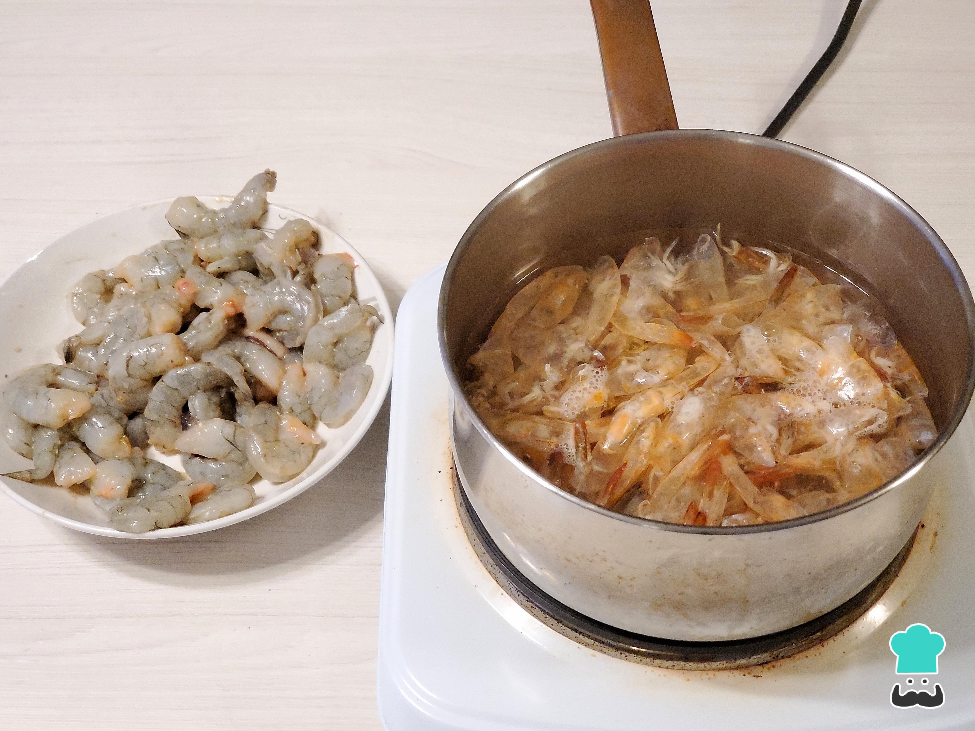Empieza lavando y limpiando los langostinos. Para limpiarlos, retira la cabeza, pélalos y reserva solo el caparazón. En la parte dorsal de la cola del langostino, haz una pequeña incisión y con la ayuda de un palillo o la punta del cuchillo, jala cuidadosamente el intestino. Si se rompe, puedes hacer otro corte para retirar el resto. Y con las carcasas realiza un caldo concentrado que ayudará a potenciar el sabor. Para ello pon a hervir una olla junto con las carcasas reservadas, luego cuela y reserva el fondo.