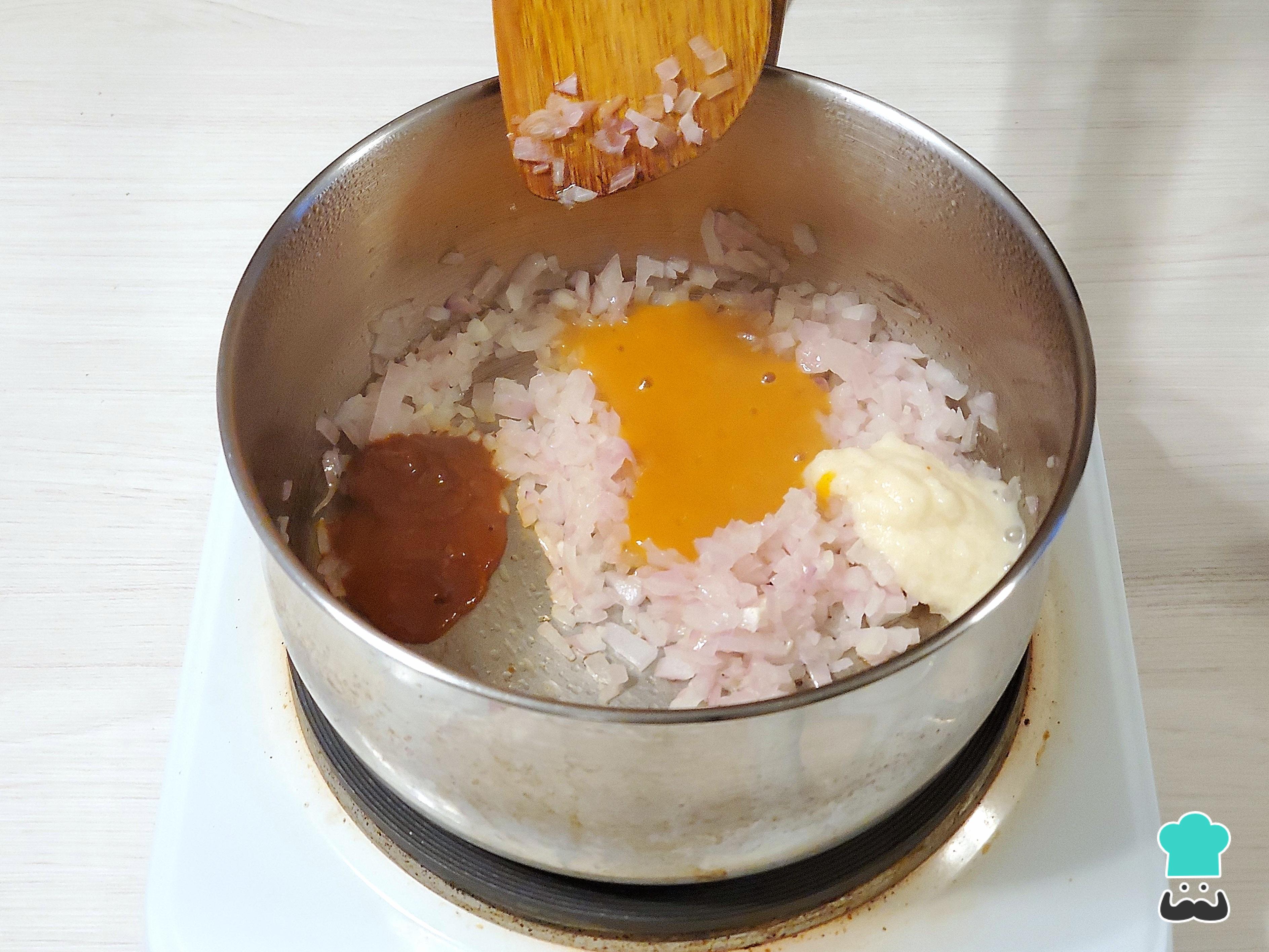 Pon una sartén a fuego y vierte un chorro de aceite. Cuando esté caliente agrega la cebolla finamente picada y sofríe moviendo de tanto en tanto hasta que se vea translúcida. A continuación, añade el ajo molido y los tres tipos de ajíes (ají amarillo, ají mirasol y ají panca). Este aderezo estará listo cuando obtenga la textura de una mermelada y empiece a separarse ligeramente de la grasa.