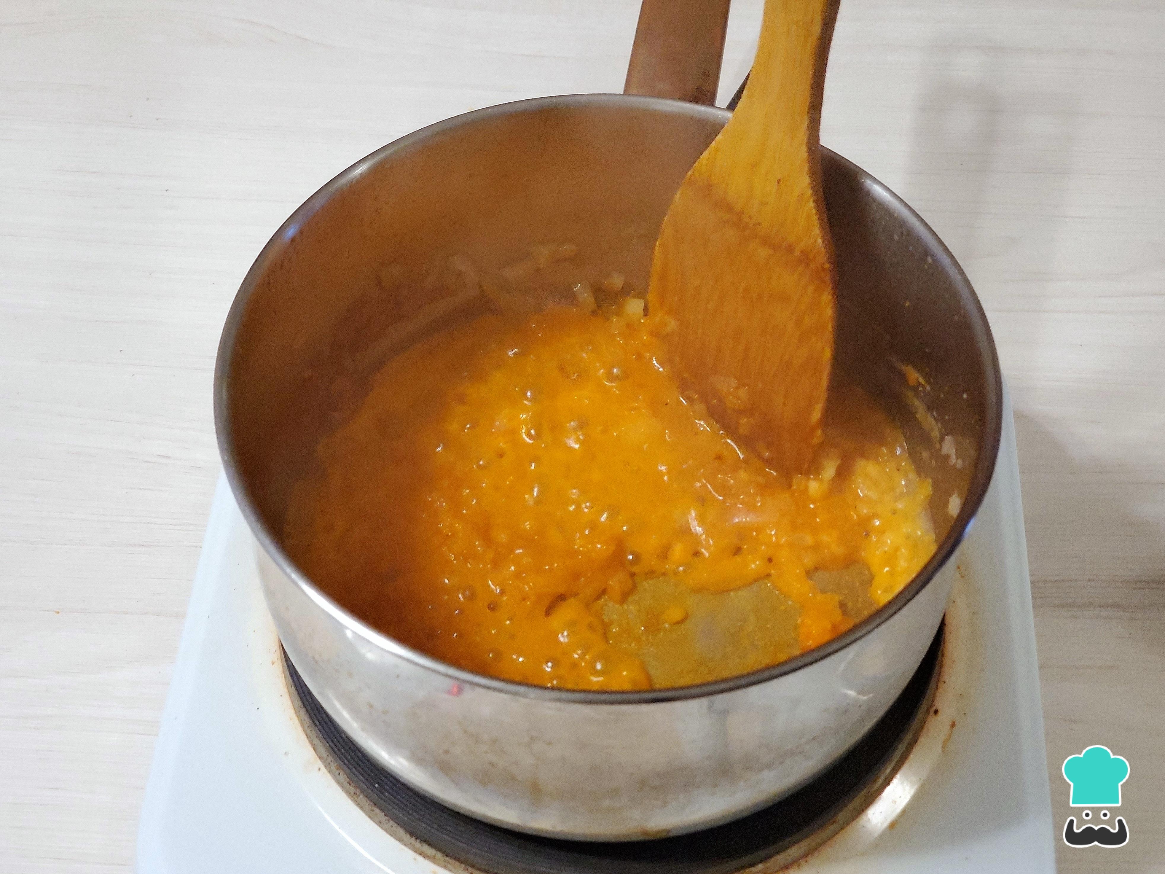 Vierte el fondo de langostinos por cucharones, con un par de cucharadas será suficiente, no queremos una salsa muy líquida. Deja que llegue a ebullición y reserva. Mientras rompe hervor, remoja el pan en la crema de leche hasta que esté completamente deshecho. Reserva.