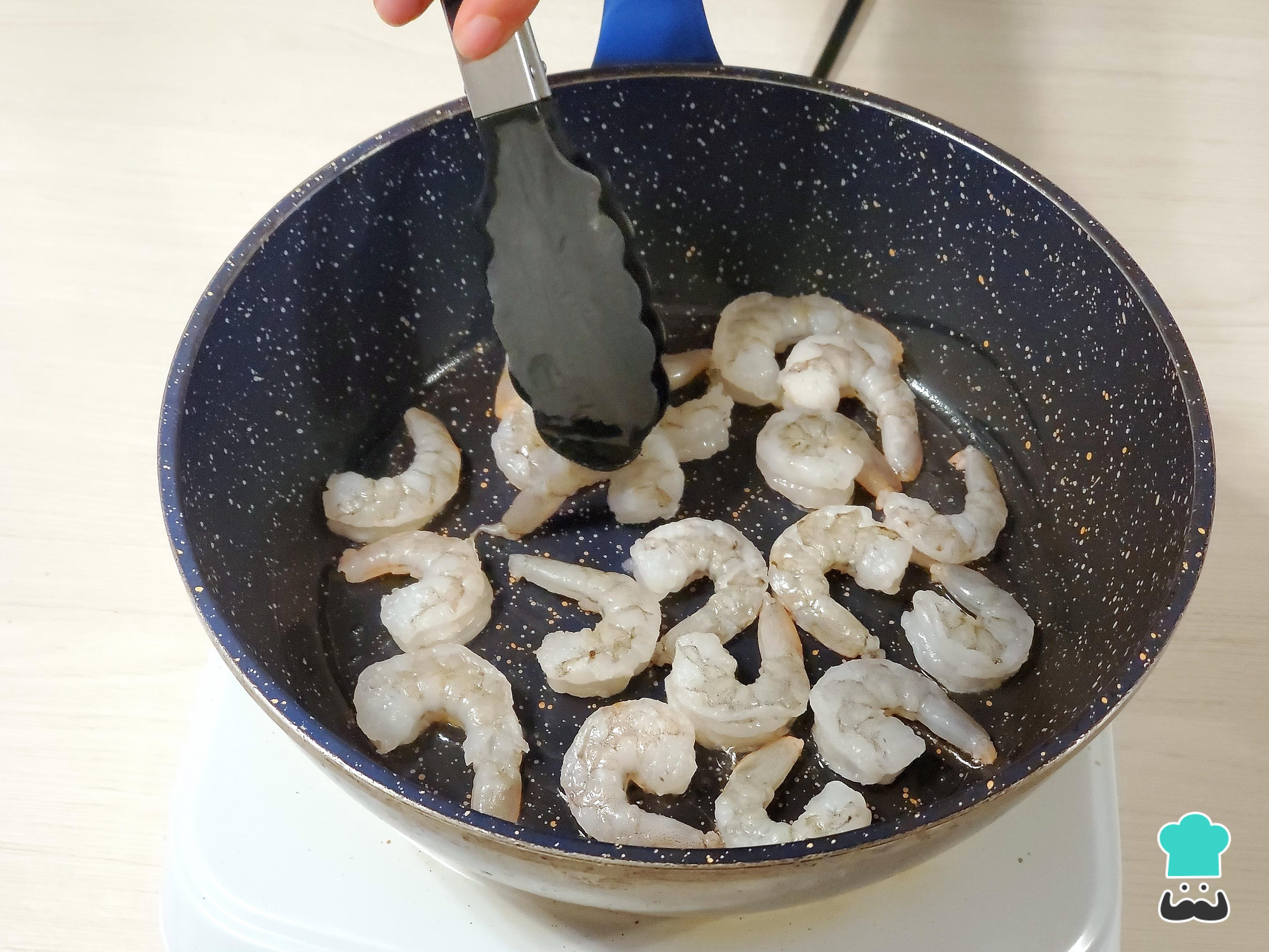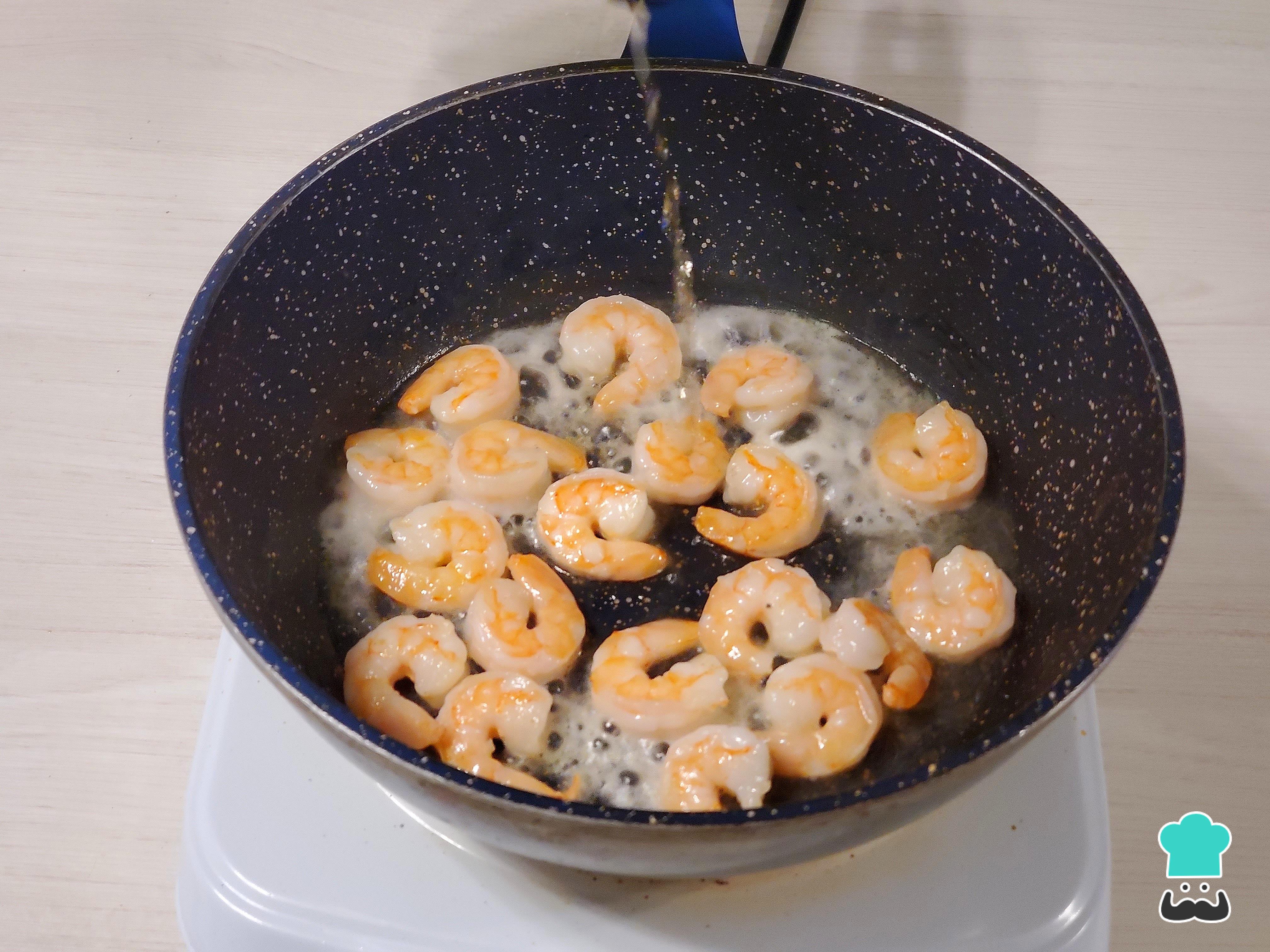 Rápidamente, sin dejar que los langostinos se cocinen por completo, vierte un chorro de vino blanco y saltea hasta evaporar.
