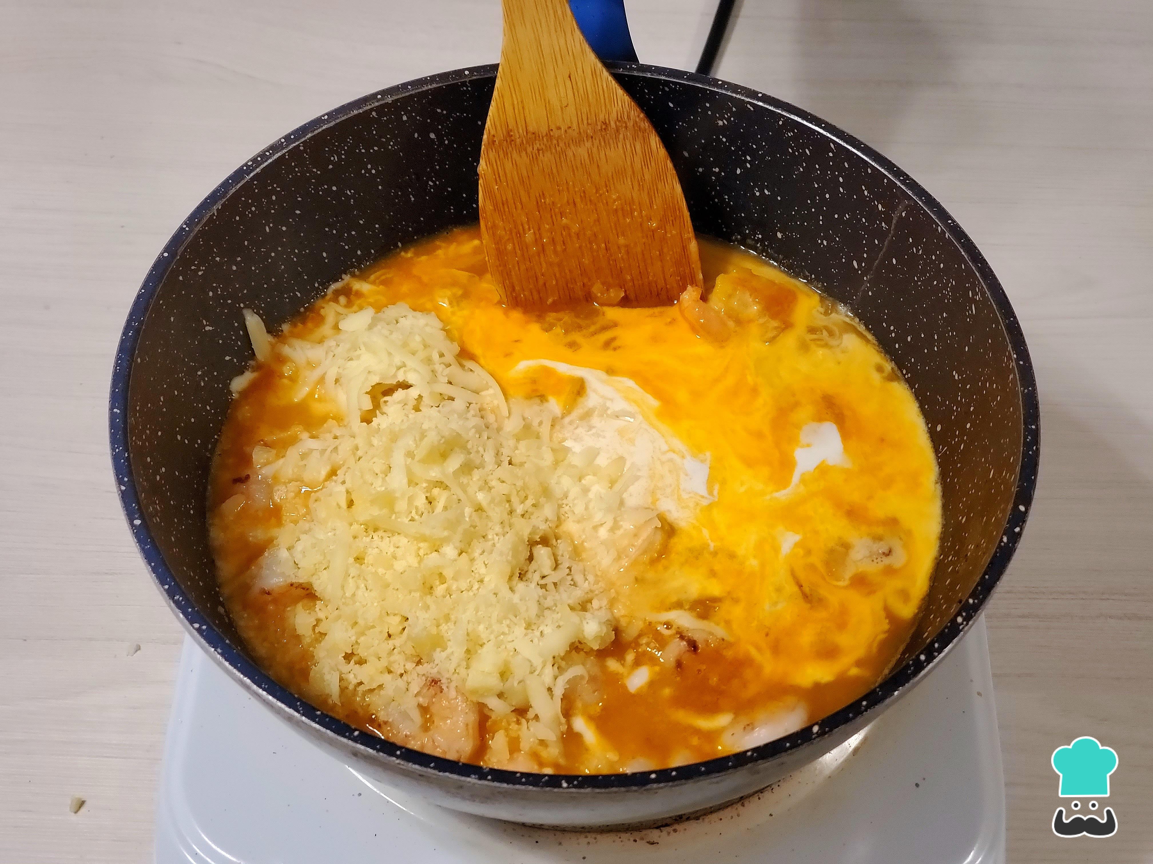Sobre estos langostinos salteados, añade el contenido de la sartén que se preparó primero, la crema de leche con pan y los quesos rallados.
