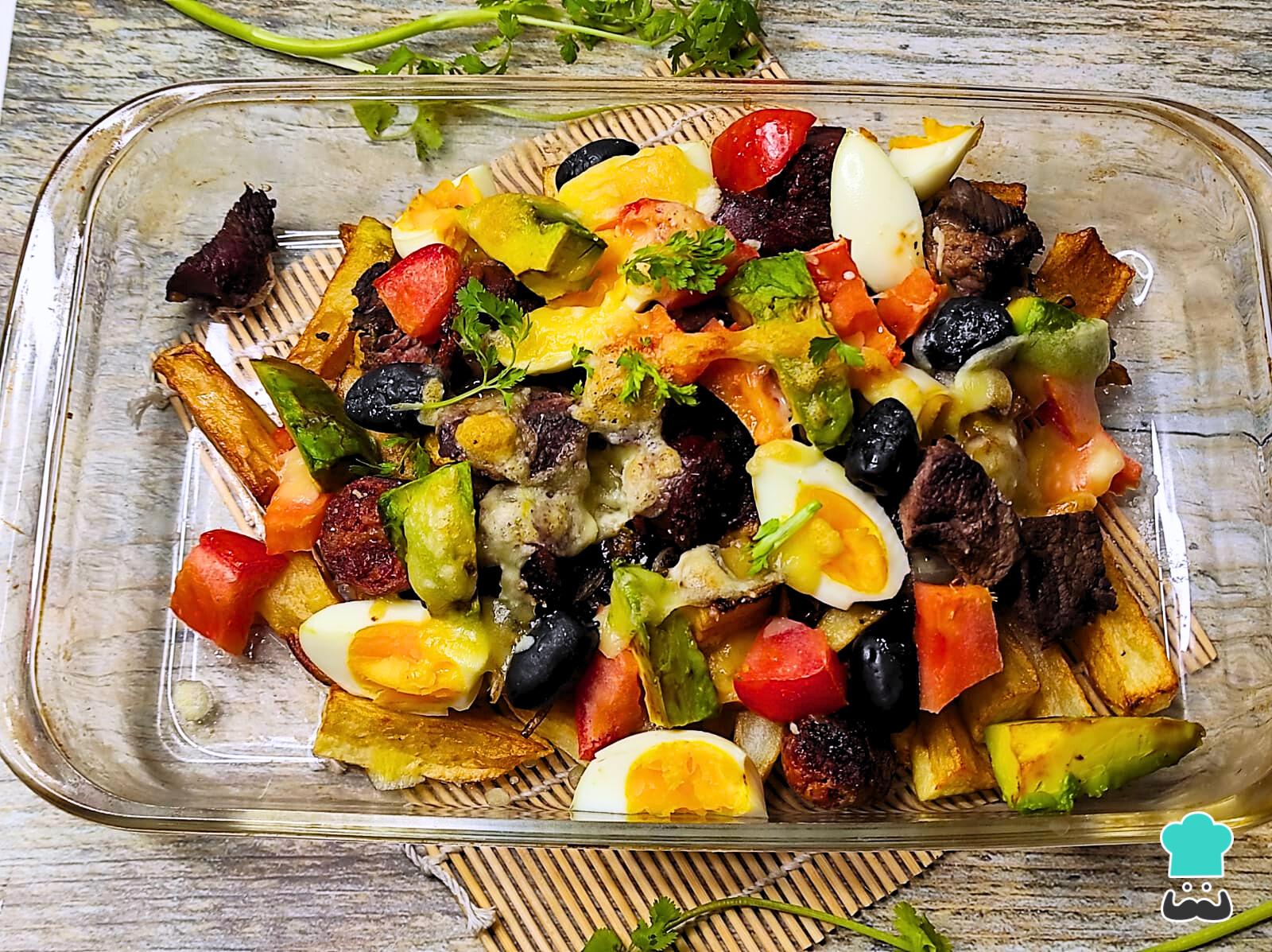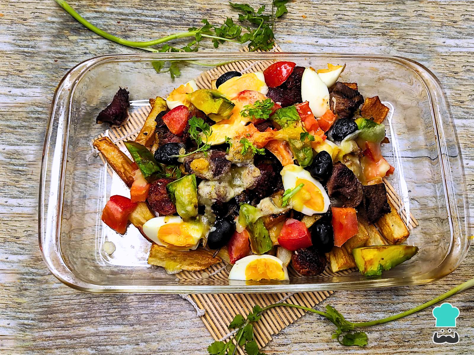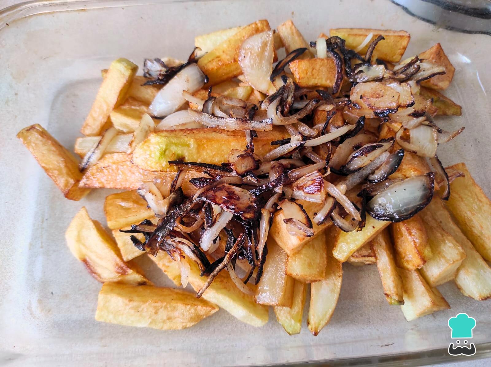 Ahora es tiempo del armado. En una fuente apta para horno, coloca las papas fritas en la base y corona con la cebolla. Aliña a tu gusto en este momento.