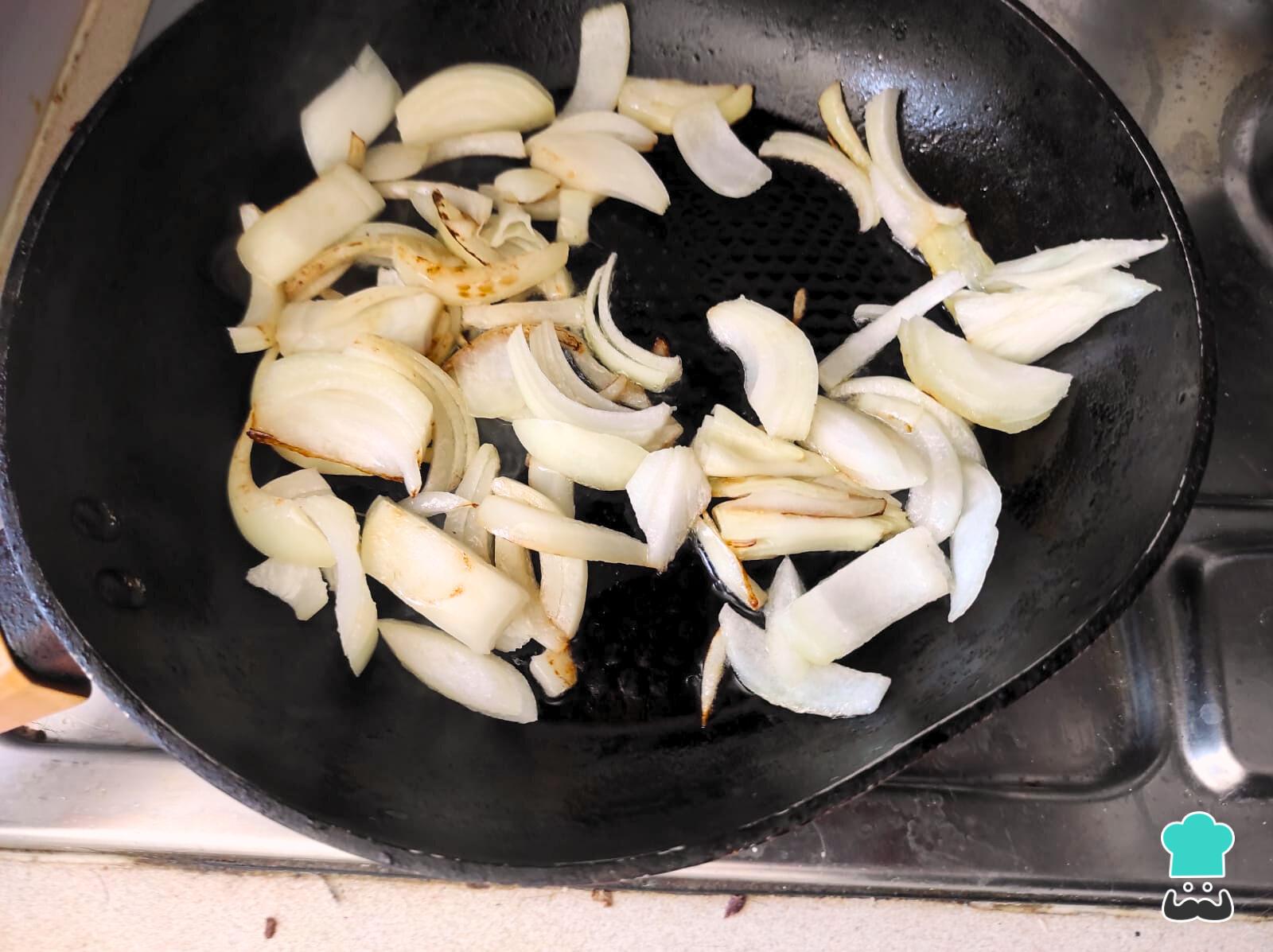 Aparte, en una sartén con aceite, saltea la cebolla cortada en pluma gruesa por aproximadamente 4 minutos o hasta que esté cocida.