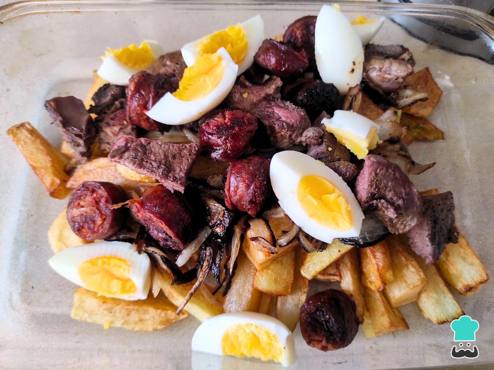 Coloca encima los trozos de carne, longaniza y los huevos duros previamente pelados y cortados en cuartos.