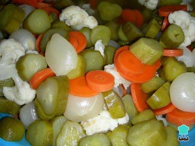 Mezclar todas las hortalizas y vegetales en un bol y sumergirlos en el vinagre agregándole la sal y el agua.
