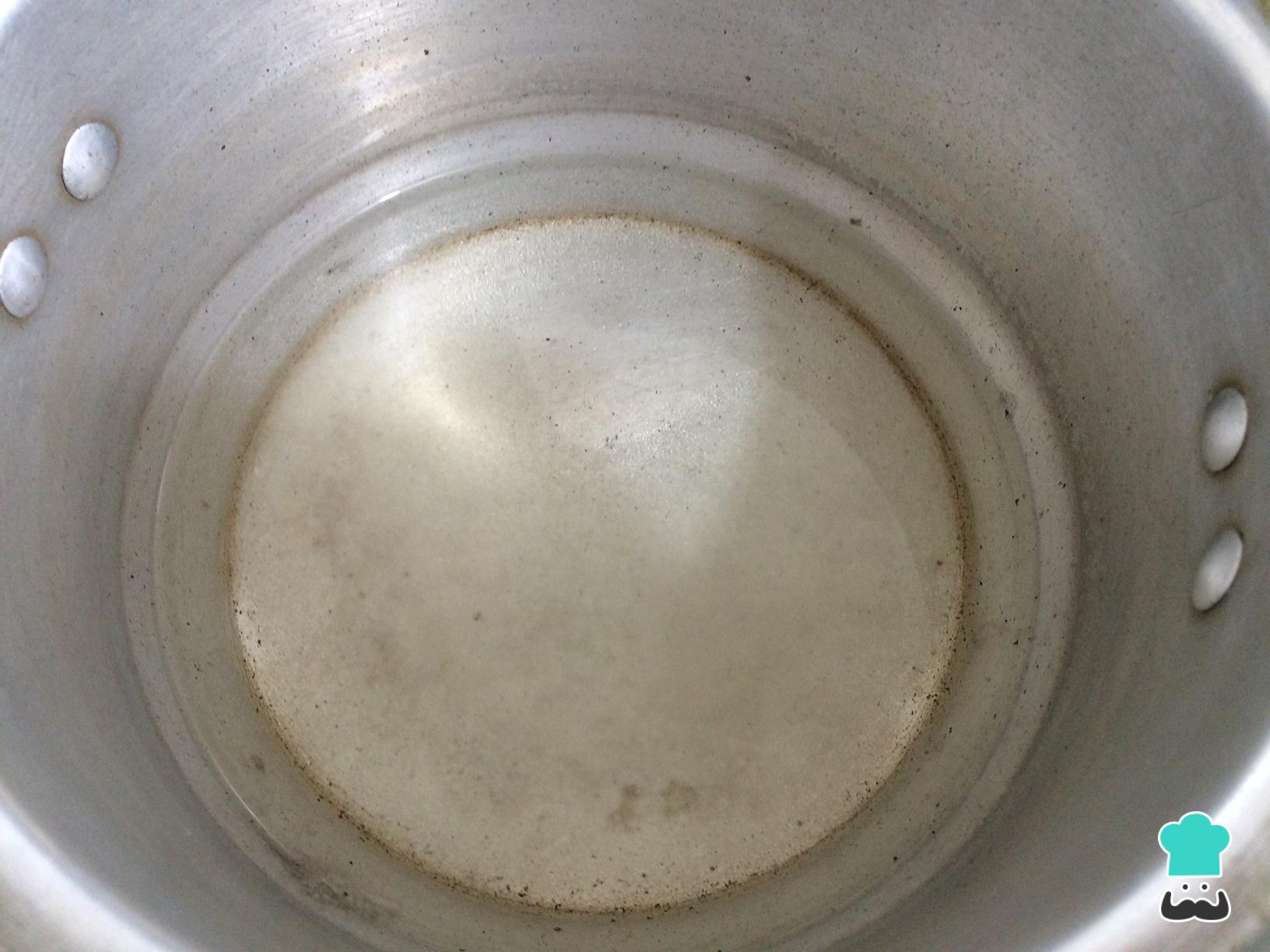 En una olla disponer el agua con el vinagre y el azúcar. Cocinar a fuego bajo hasta que rompa hervor. Esto será el almíbar para hacer los pimientos caramelizados.