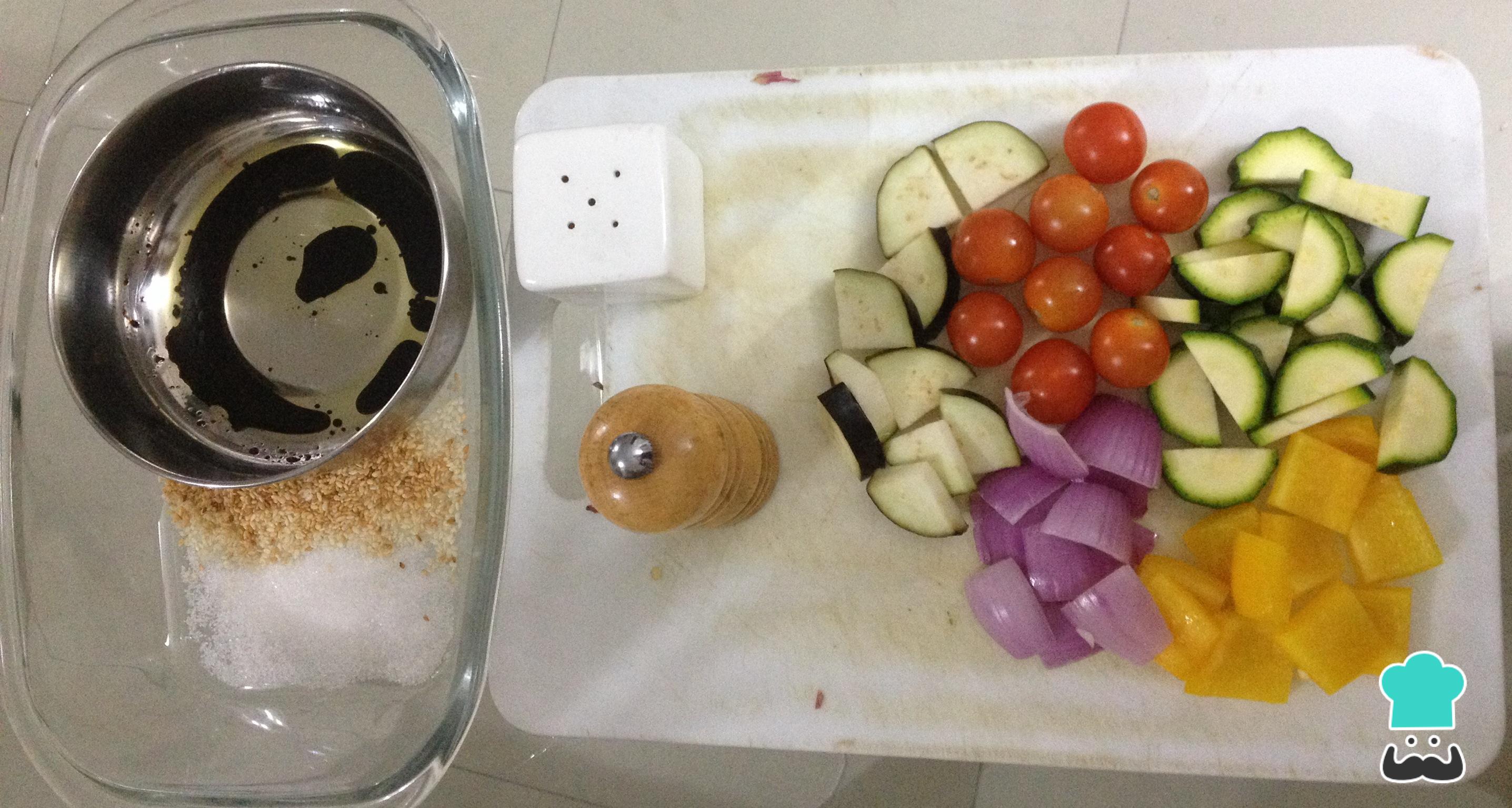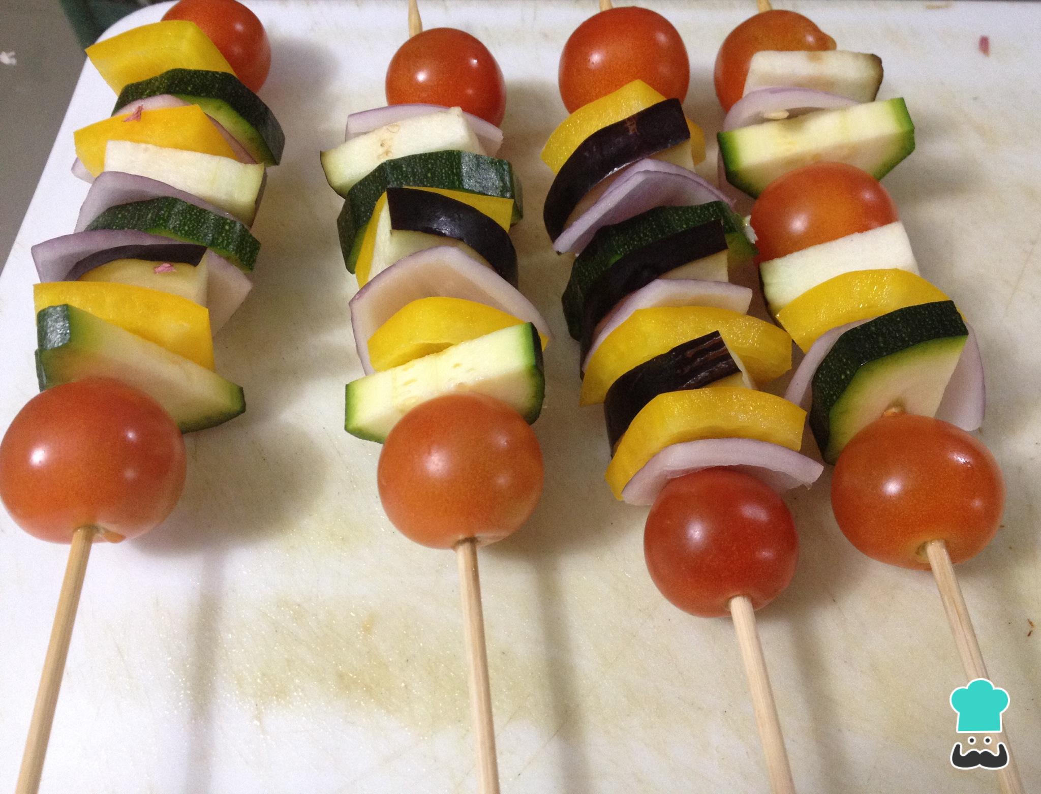 Cortar las verduras de un mismo tamaño, guiarse por el tamaño de los tomates cherry.Armar los pinchos intercalando las verduras.