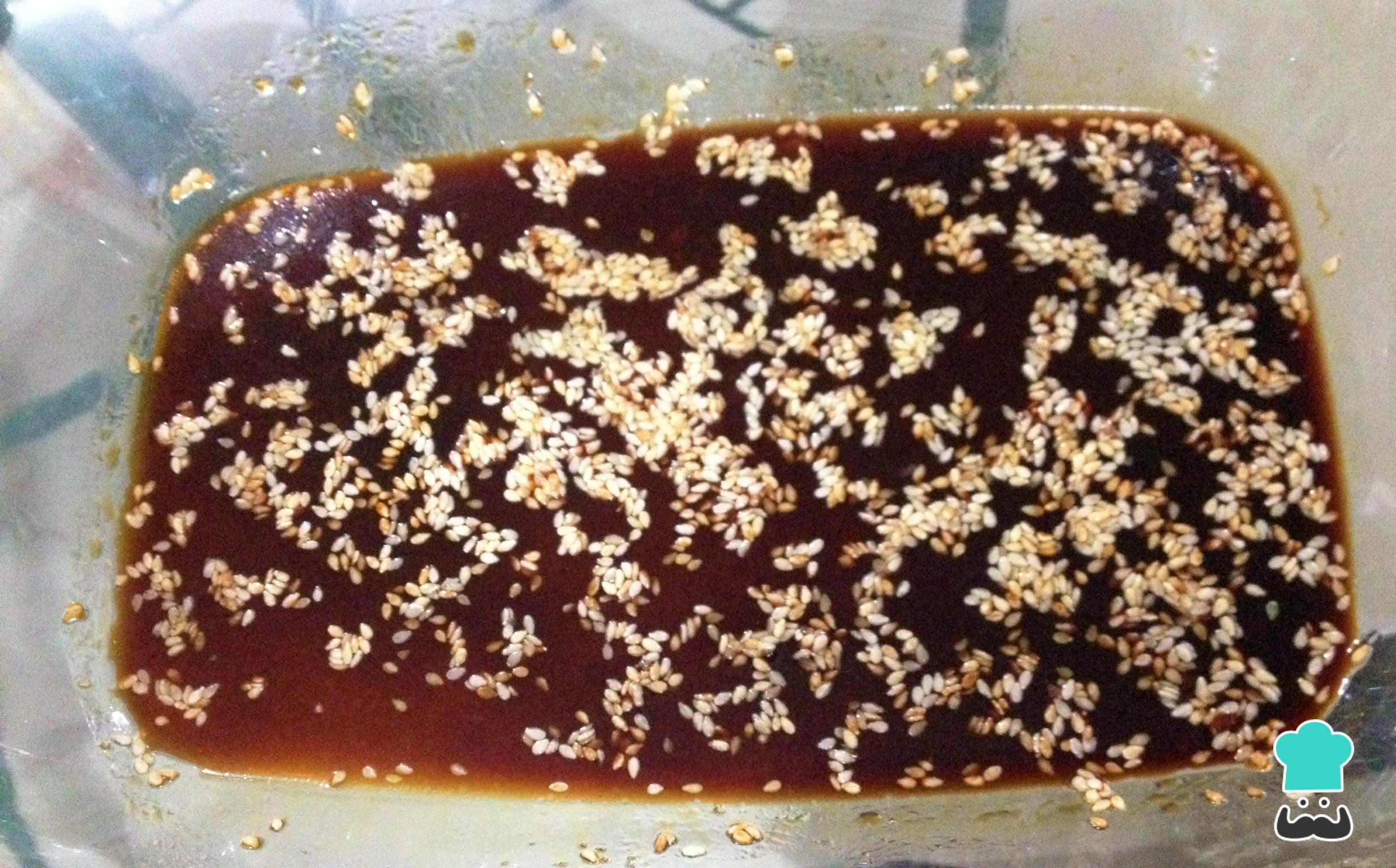 En una refractaria rectángula, agregar la salsa de soja, las semillas de ajonjolí, el azúcar y el aceite de oliva y un poco de agua, revolver y lograr una mezcla homogénea.