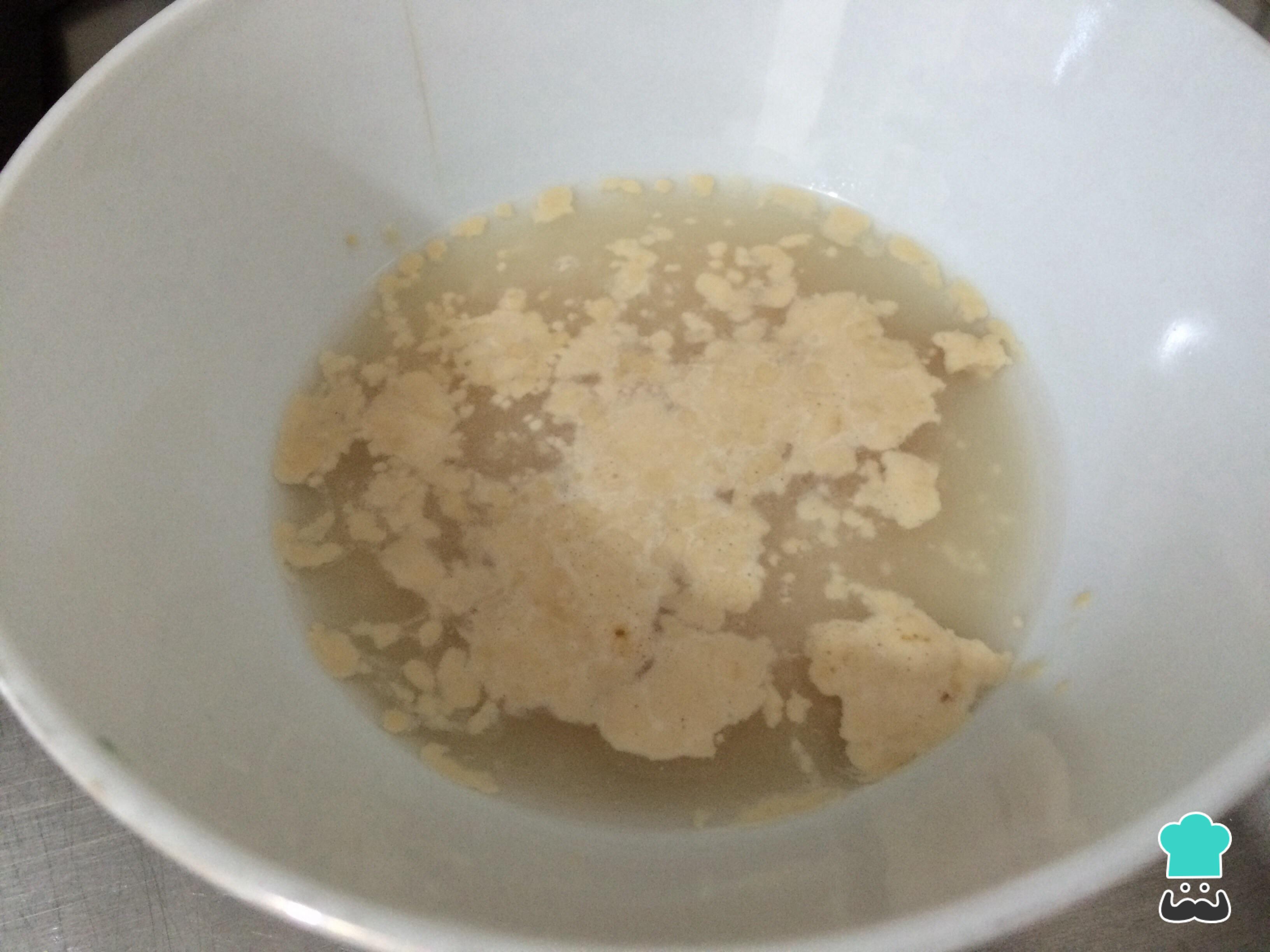 En un bol añadir el agua tibia con la levadura seca y una pizca de azúcar, esperar 5 minutos hasta que la levadura se active.