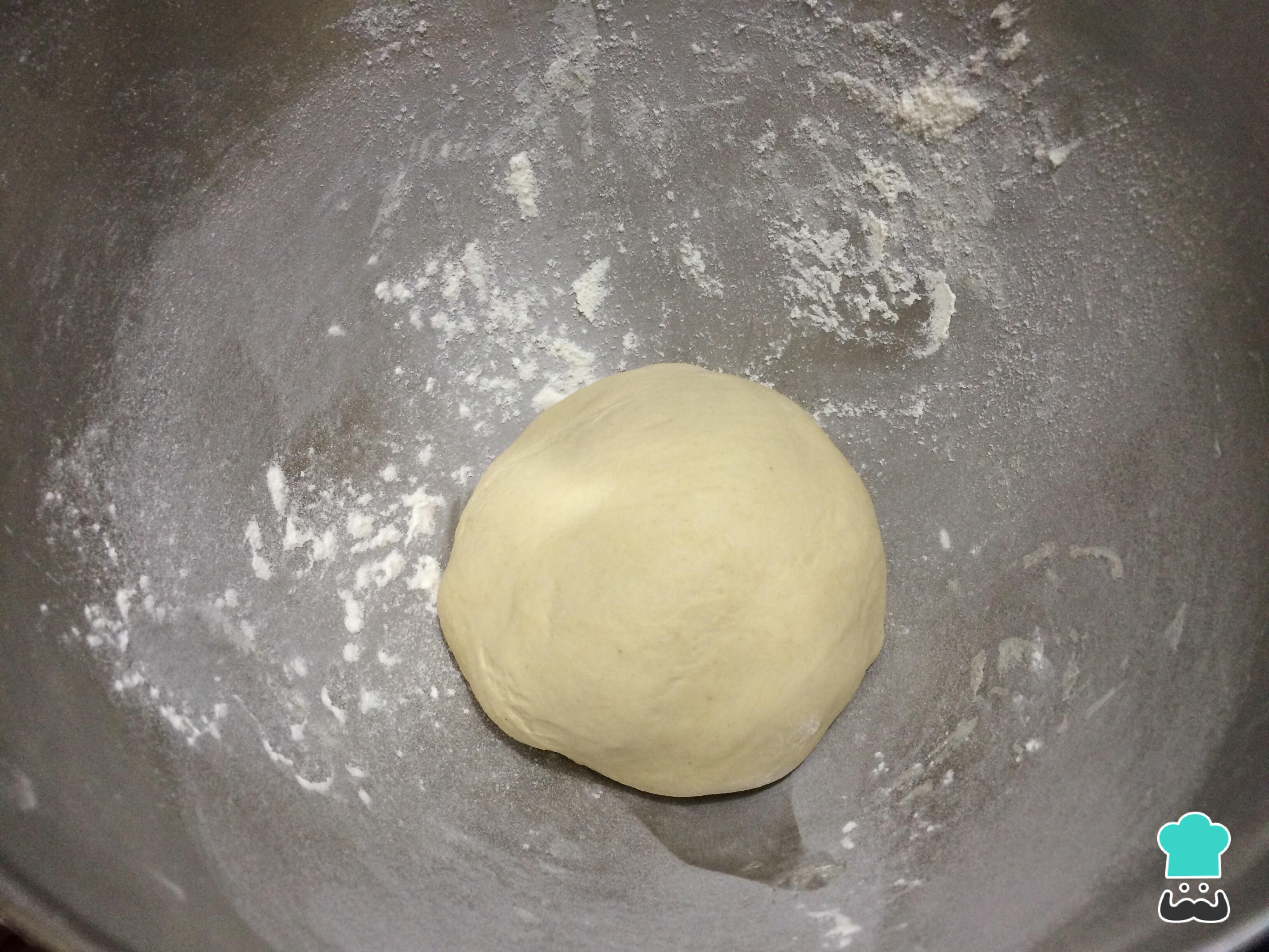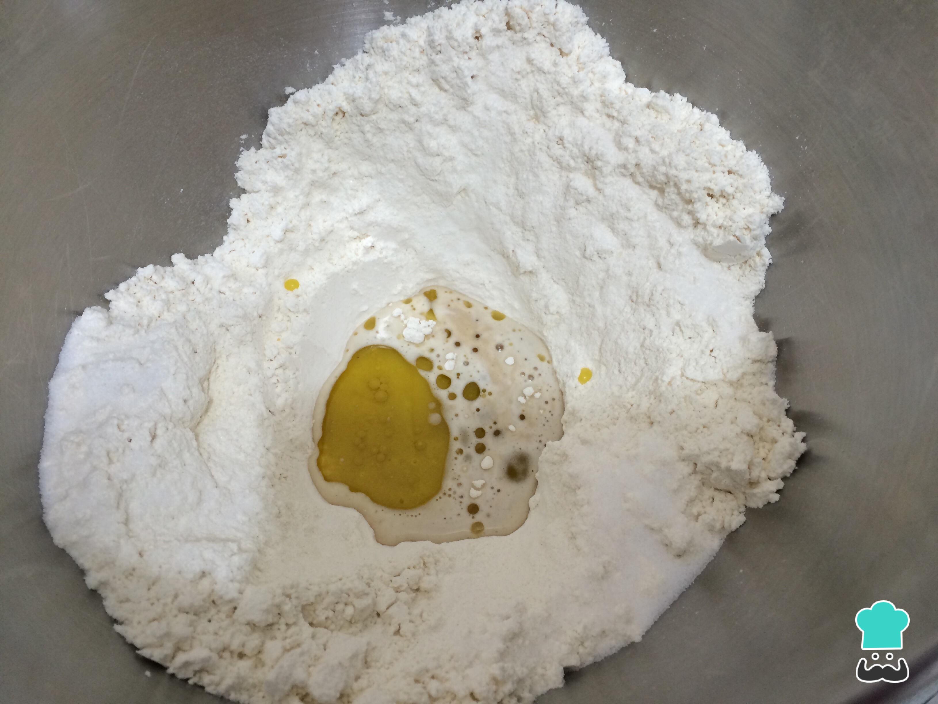 Mezclar todo añadiendo harina en el centro del volcán de a poco. Cuando tengamos una mezcla pareja, amasar durante 15 minutos hasta obtener una masa suave y homogénea. En un bol enharinado añadir la masa con un paño húmedo sobre ésta y dejar el bol en una zona cálida y esperar a que leude la masa, aproximadamente 2 horas.