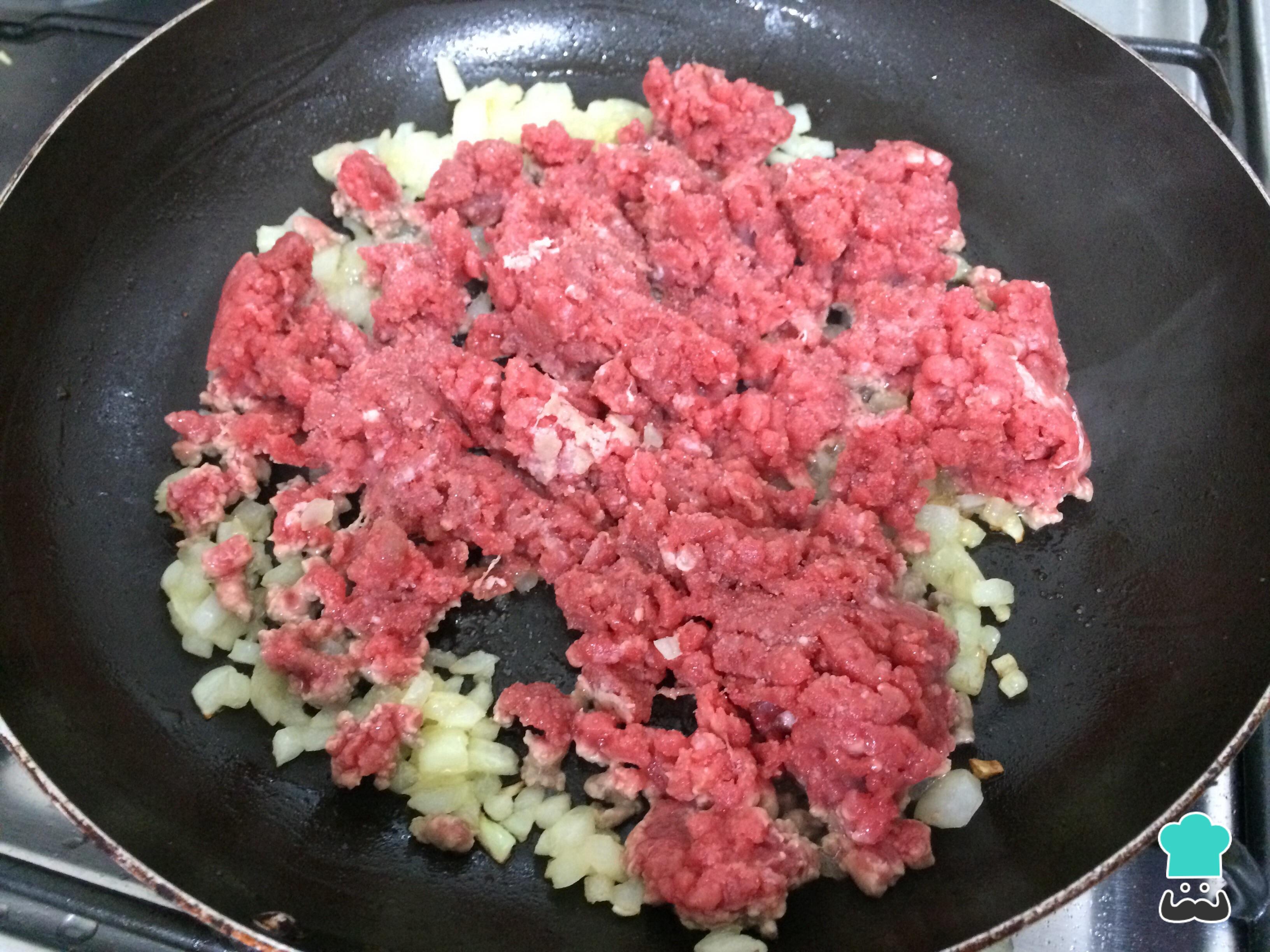 Aparte en una sartén con aceite de oliva, sofreír la cebolla cortada en cubos pequeños con la carne molida, cocinar durante 5 minutos, salpimentar.